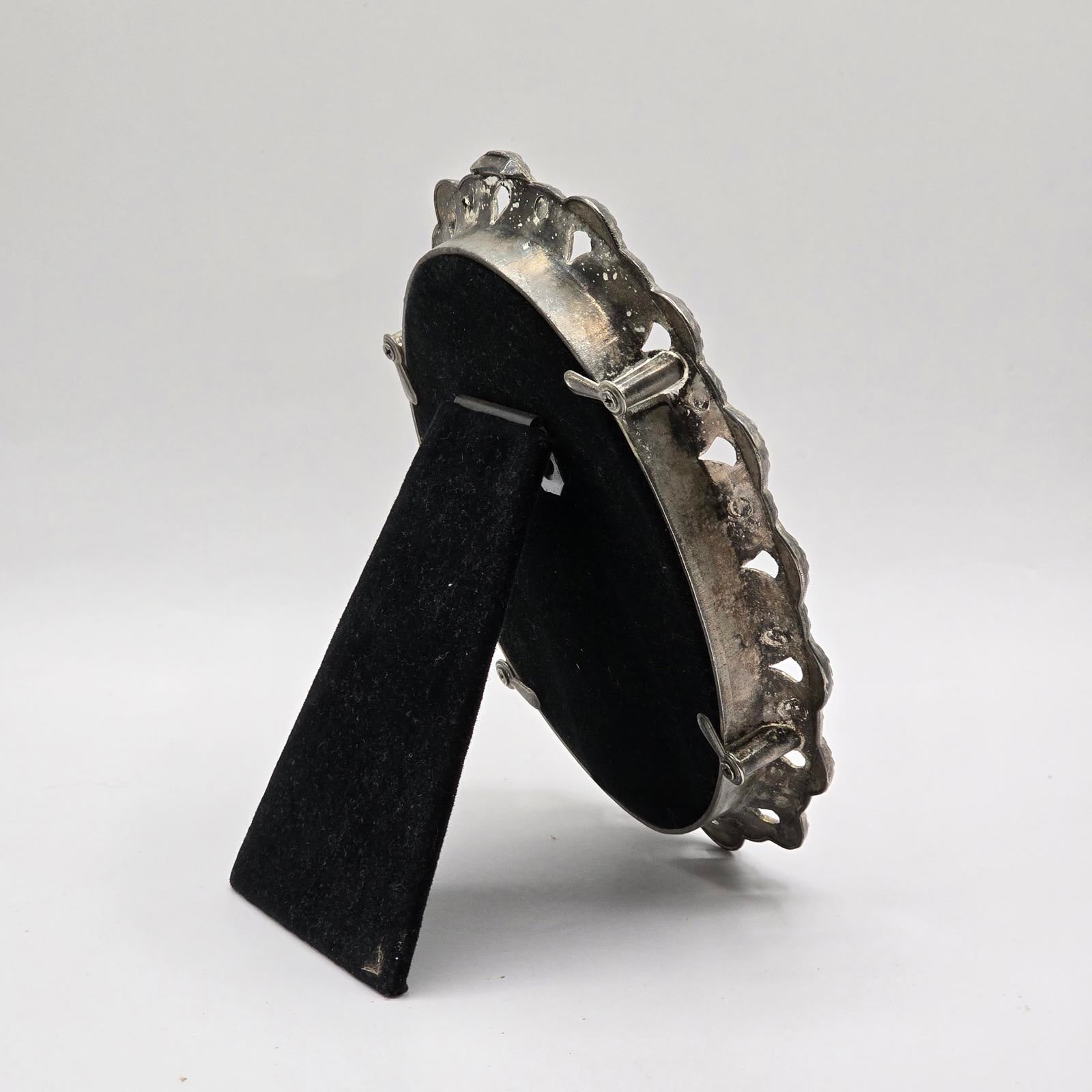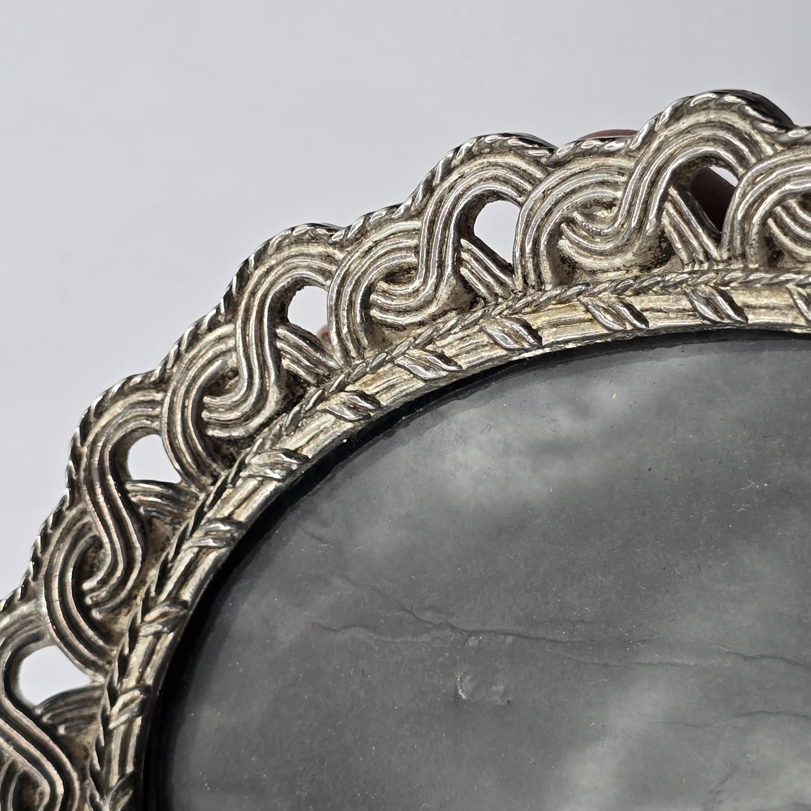 Celtic influenced oval frame with braided trim. Silver finish(possibly pewter). Interior measures 3.5" x 4.75" for your favorite photo. Please refer to the photos as they are part of the description. Approximately 4.75"x 6.25" exterior.