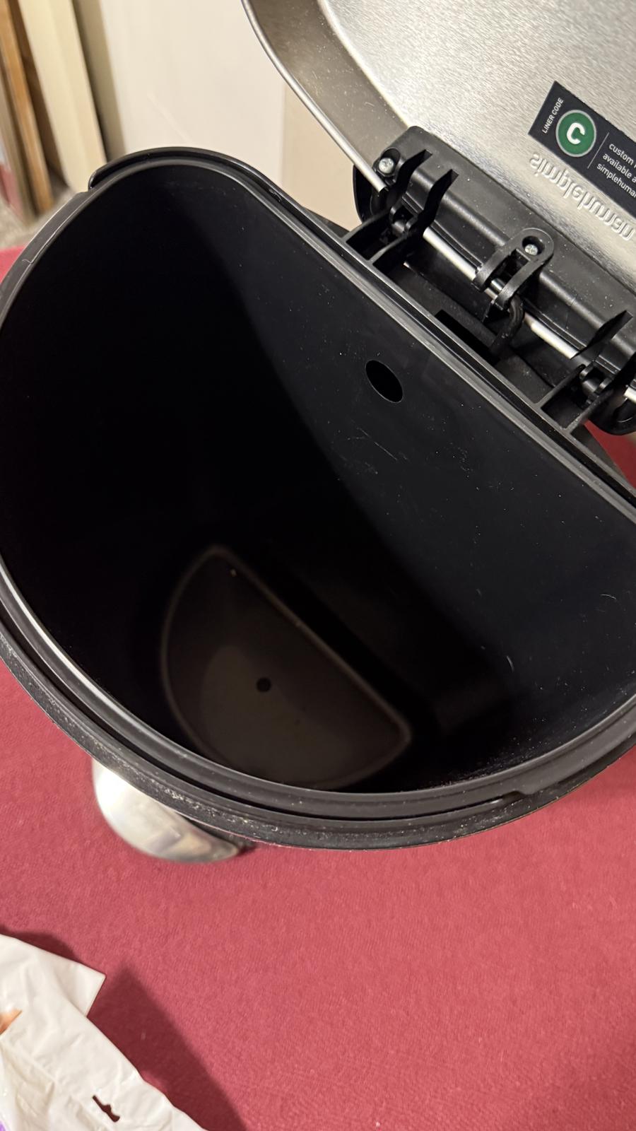 The simplehuman space-efficient semi-round step can is perfect for smaller spaces like a bathroom or an office. The strong steel pedal is built to last, and lid shox technology ensures a smooth, silent close every time. A removable inner bucket makes for easy trash disposal. Shows some signs of wear. 10.6 x 11.2 x 17.5 inches