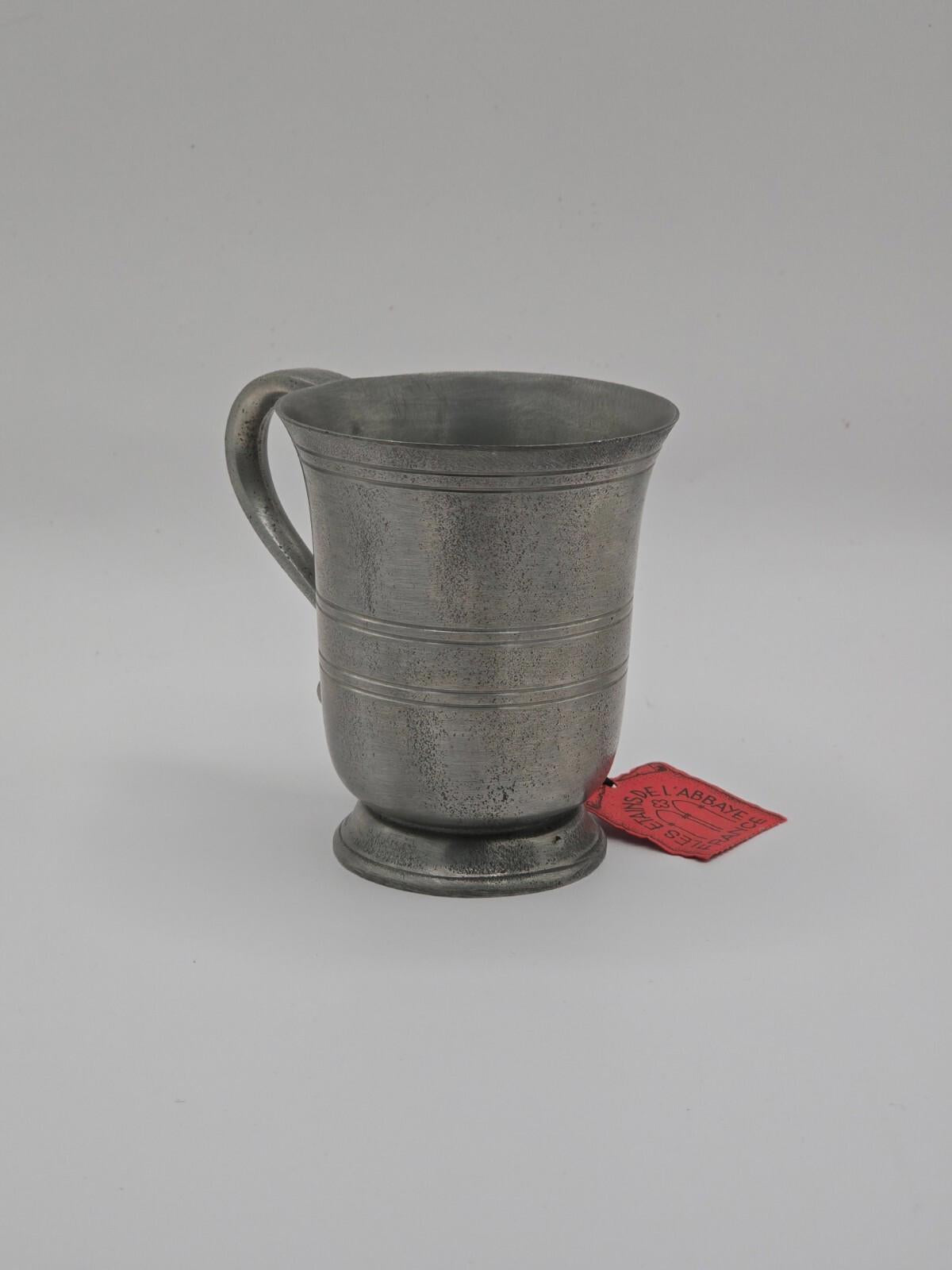 Reproduction of an ancient pitcher. Made in France by Les Etains De L'Abbaye. 3.5" T x 3" W (w/o handle, 4.25" W w/ handle)