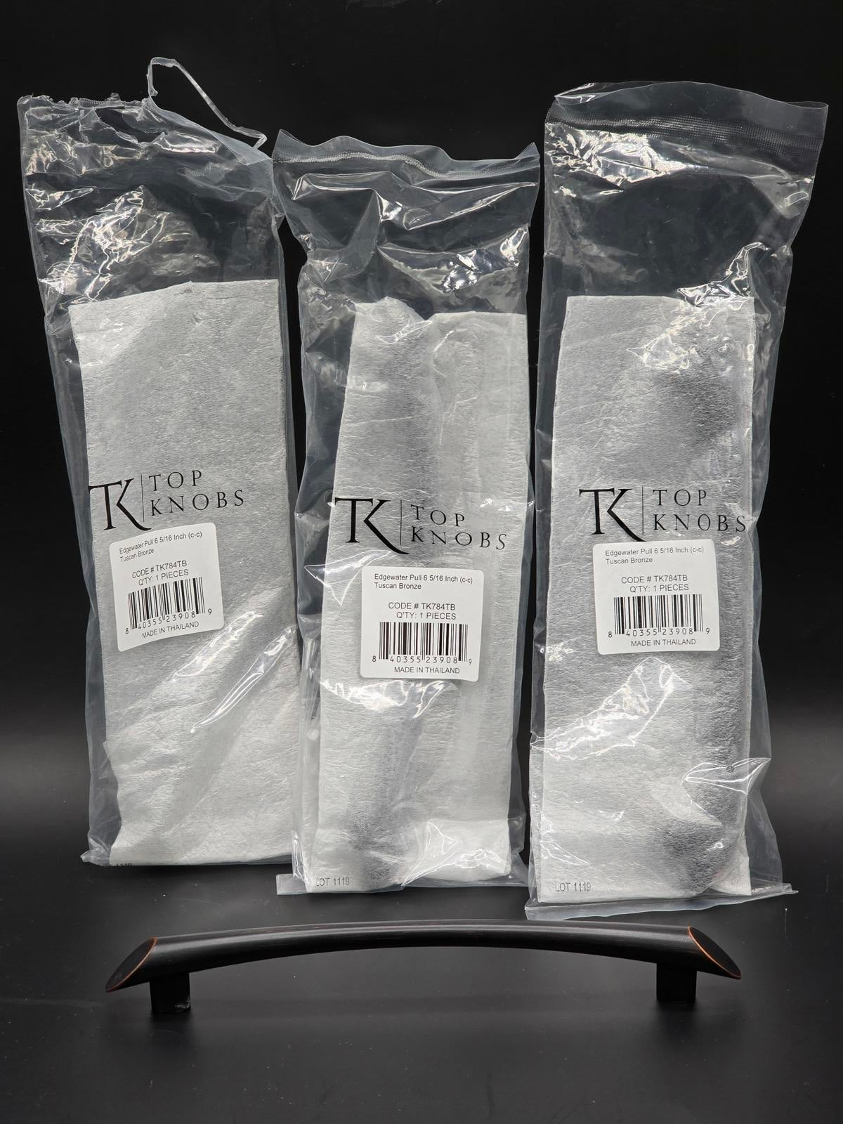Set of 3 quality Tuscan Bronze Top Knobs drawer pulls model TK784TB. Center-to-Center 6-5/16". Total measurements 7-15/16"L x 5/16"W x 1-3/16"Projection.