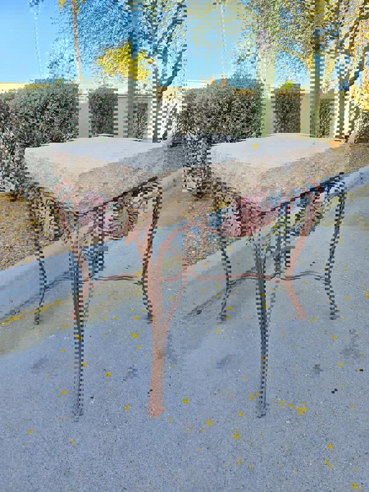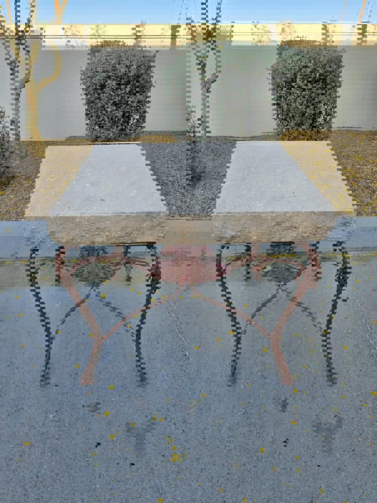 Solid Iron base with 3.25 inch genuine thick Travertine stone top. Very heavy, base can be repainted to coordinate as a beautiful accent for your home. 26"L x 21.5"W x 23.75"T