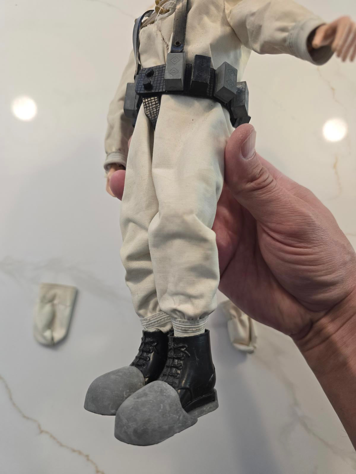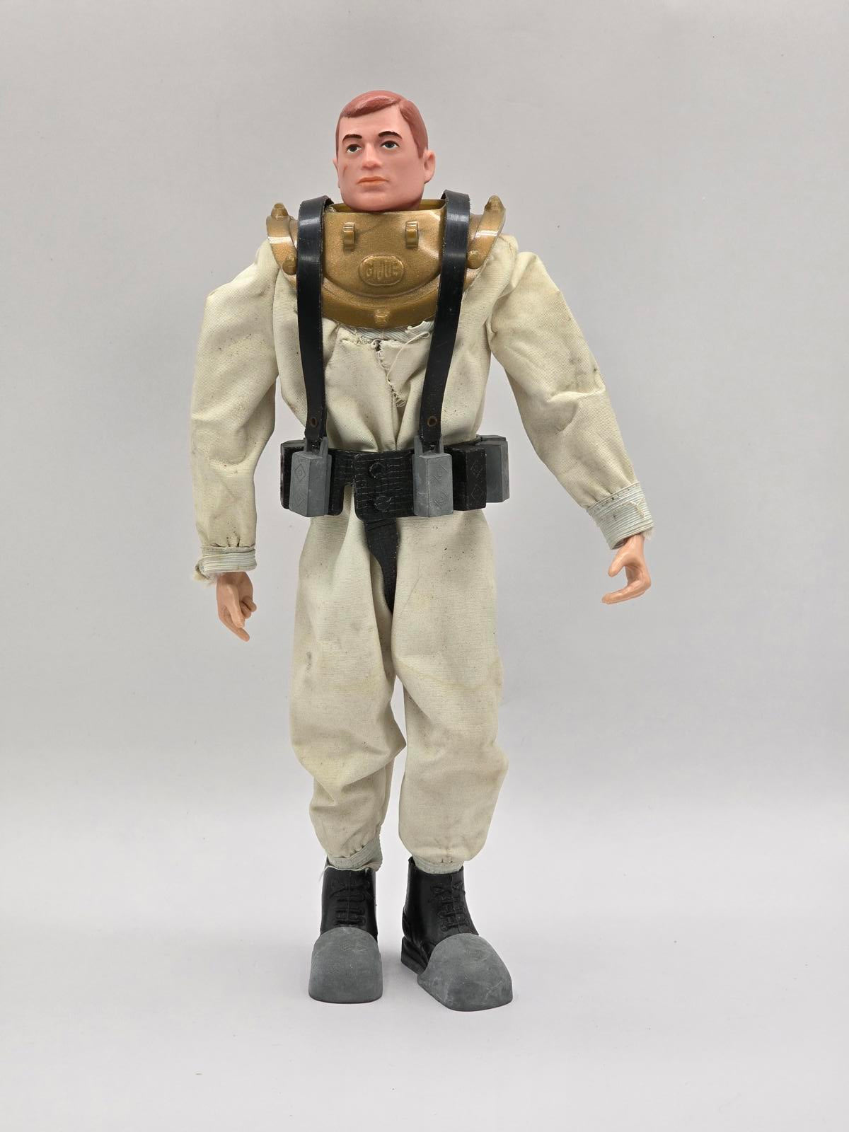 Vintage 1964 Hasbro G.I. Joe Deep Sea Diver with gloves and hammer with broken handle. Hammer is much longer and has been broken off to make a short handled version. Missing dome helmet and hoses. Suit is pretty brittle, still in good shape but should be moved much or it has risk of cracking and ripping. Crack in the plastic neck piece, stands freely. What you see is what you get.