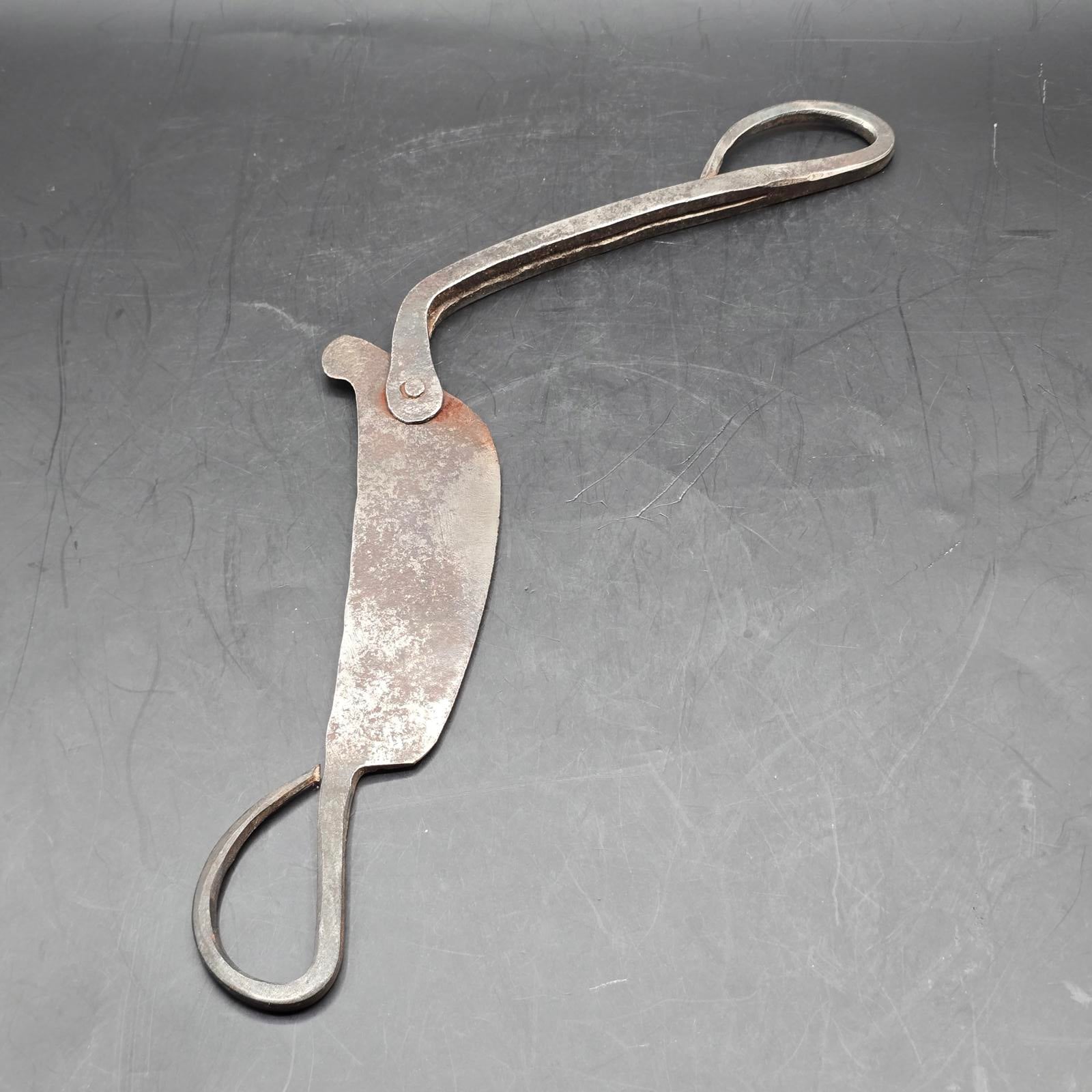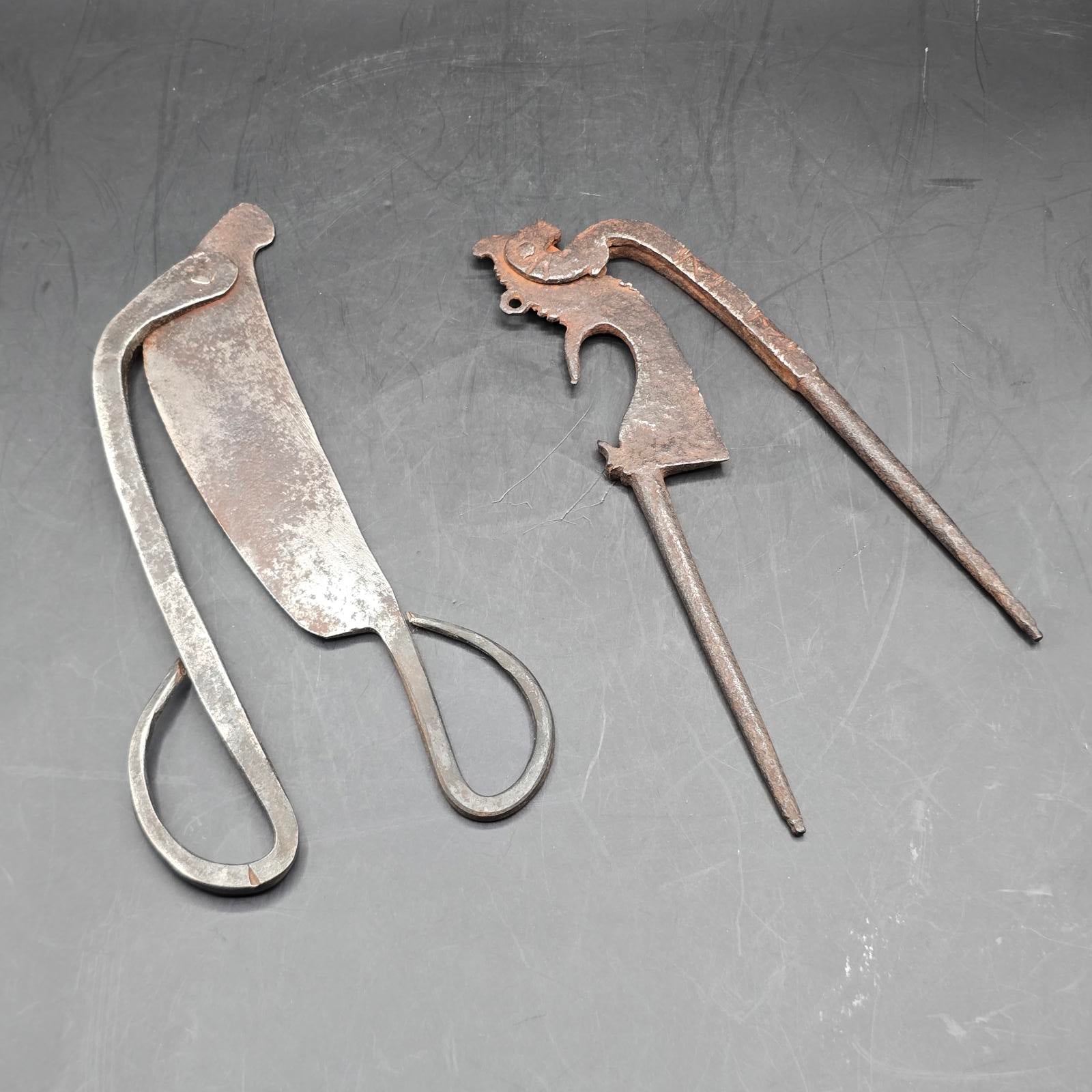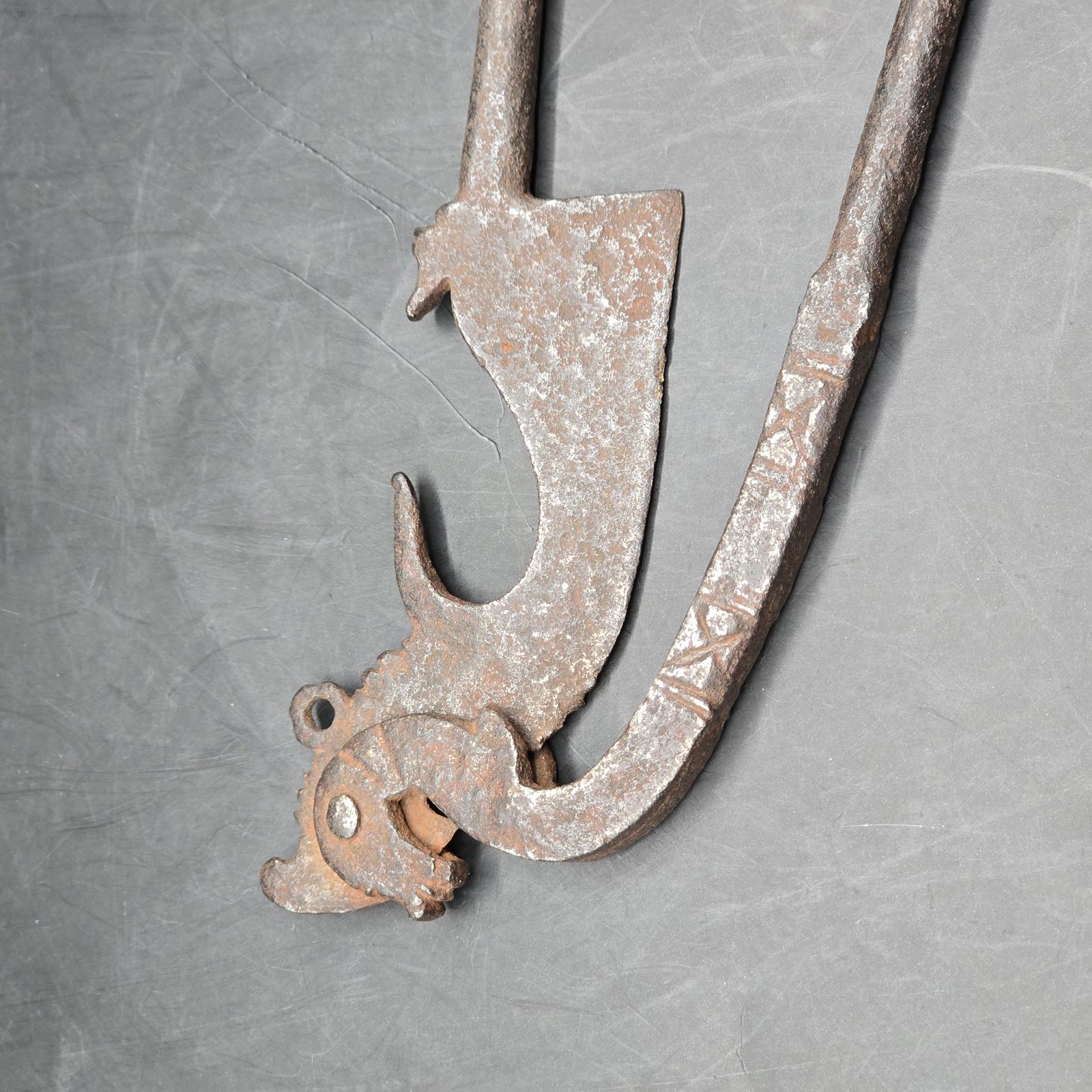 These cutters (also known as sarota or kacip), are/were used throughout Southeast Asia for the preparation of Betel Quid Chew. Betel nut chewing is an ancient practice, a sign of hospitality and an important part of many ceremonies. The nuts from the Areca Tree are placed in the trough of the cutters. The ground nuts are then combined with lime powder(produced by scraping seashells), and wrapped in betel leaves. The result is betel quid, which is mildly narcotic and a modest stimulant. It is chewed for hours and constant use often results in bright-red teeth and gums. The cutters are typically made from iron and each region has its own design. The smaller pair are most likely from Indonesia and are unique and a rare find. They date back to the late 19th-early 20th century and have an animal motif. The larger-blade, nut cutters were more typically found and used in households. Please check our listing for the set of 16th century Vietnamese lime pots.