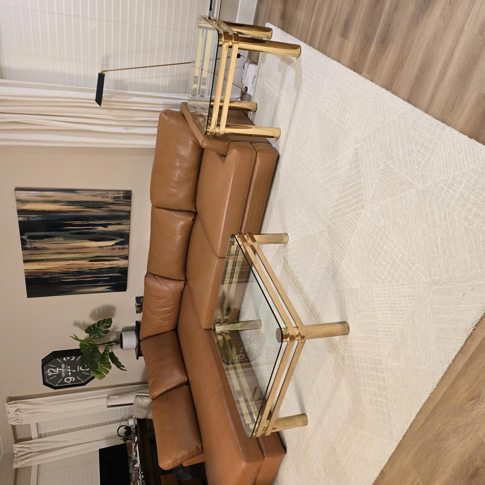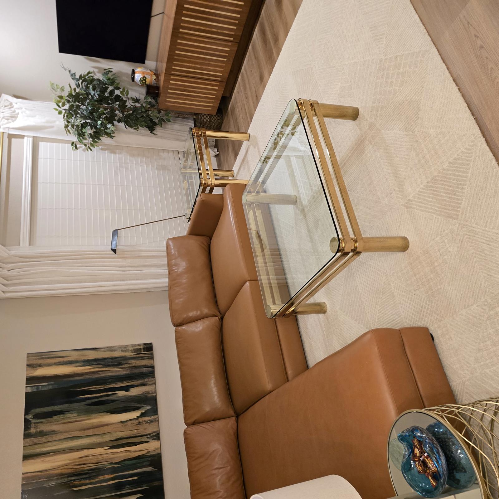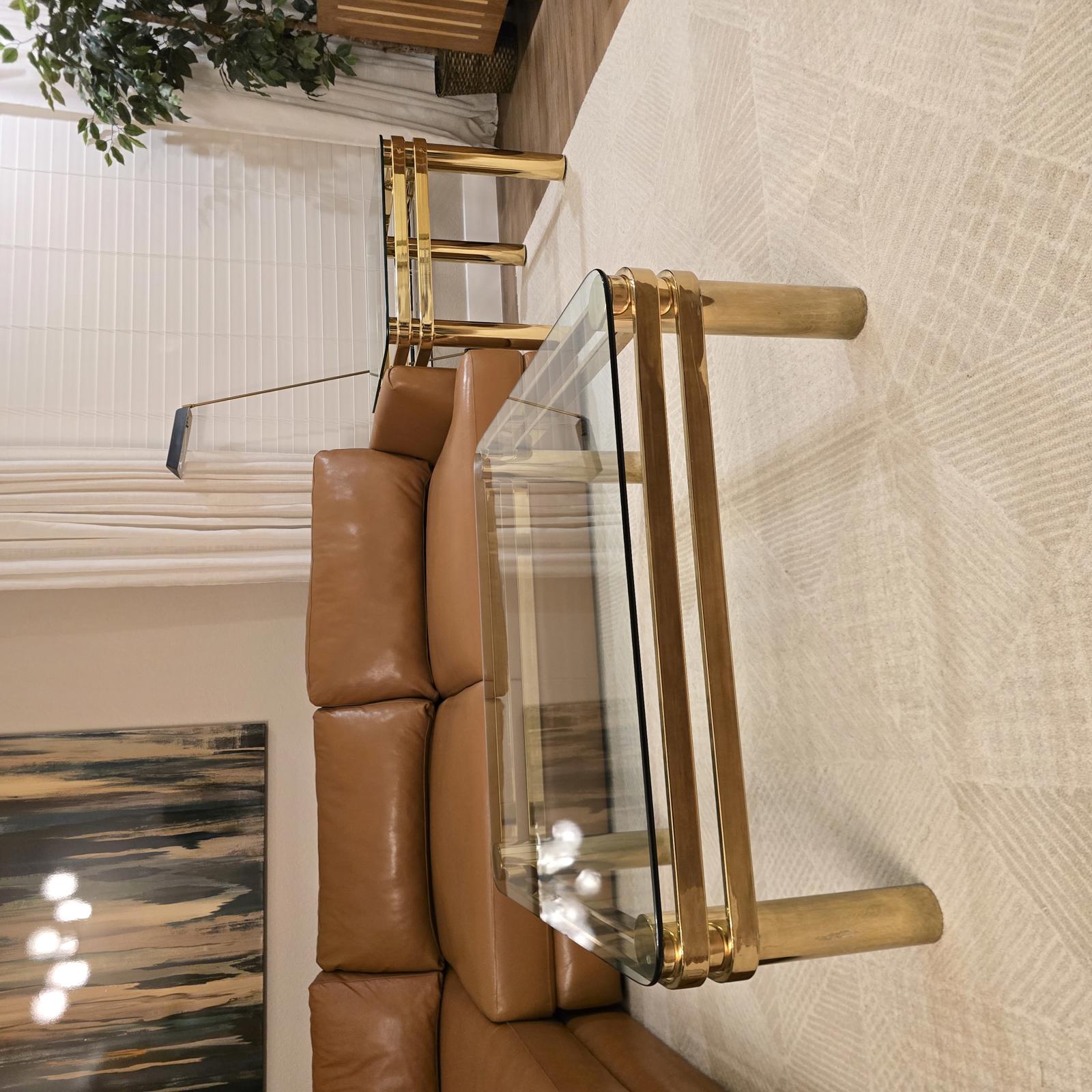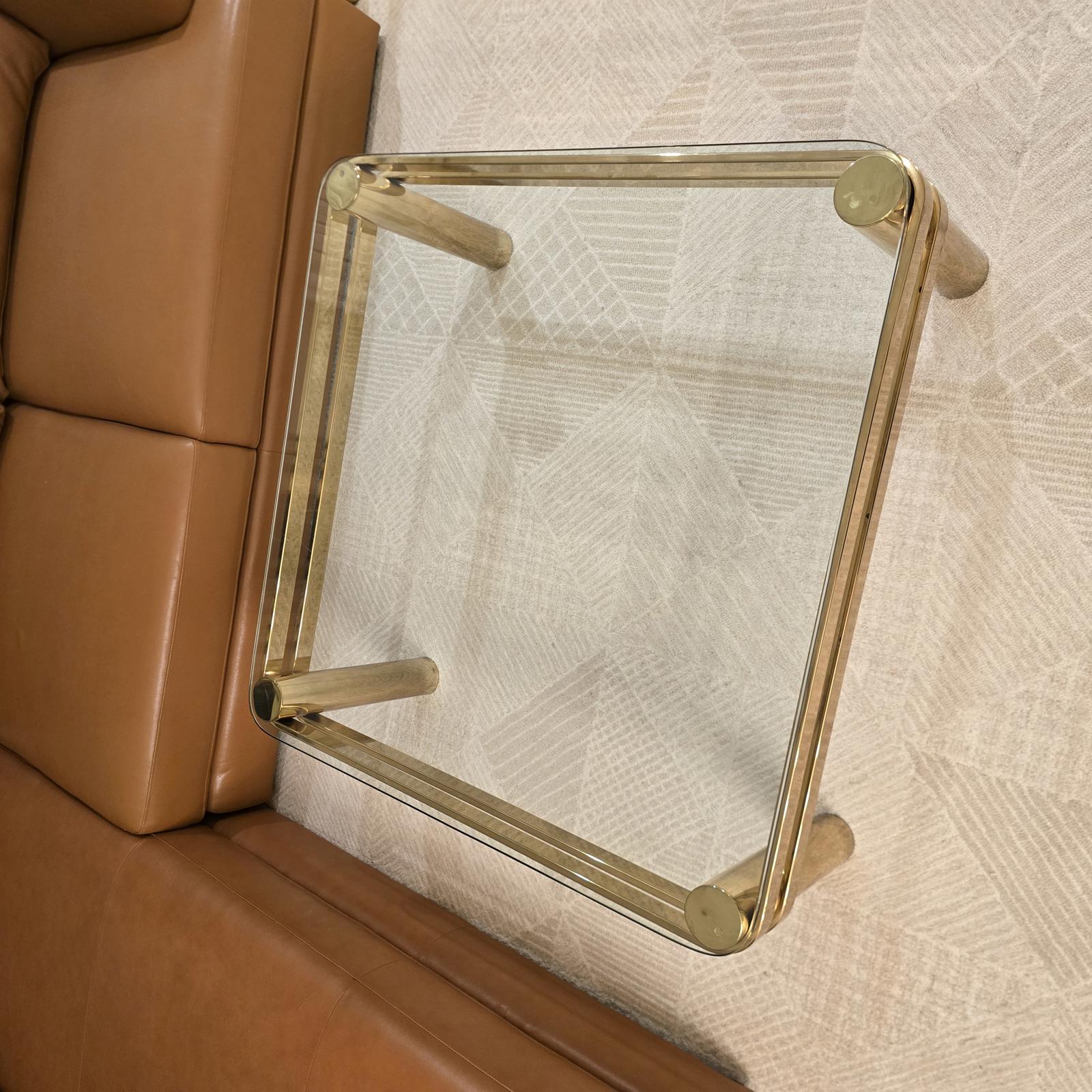 Create a curated look with this elegant coffee table that will complement almost any decor from Modern to Art Deco. Tubular brass legs are wrapped with 2 rounded, brass bands and topped with a 3/8" piece of glass with coordinating, rounded corners. c.1970's-1980's. Some scuffs and wear to the finish consistent with age and use. Please refer to the photos as they are part of the description. Measures 38" square by 16" height. End table also available, please check my listings.