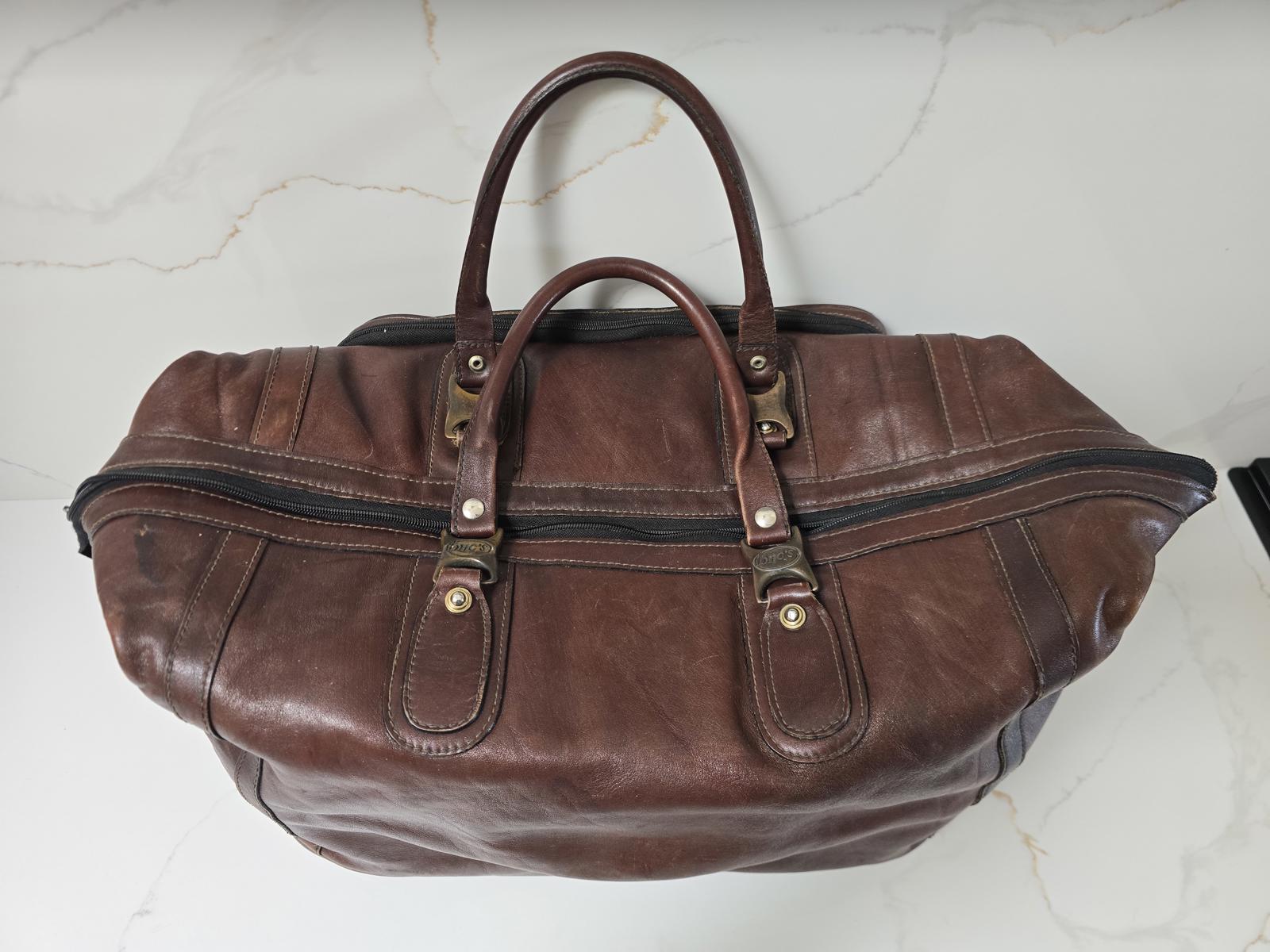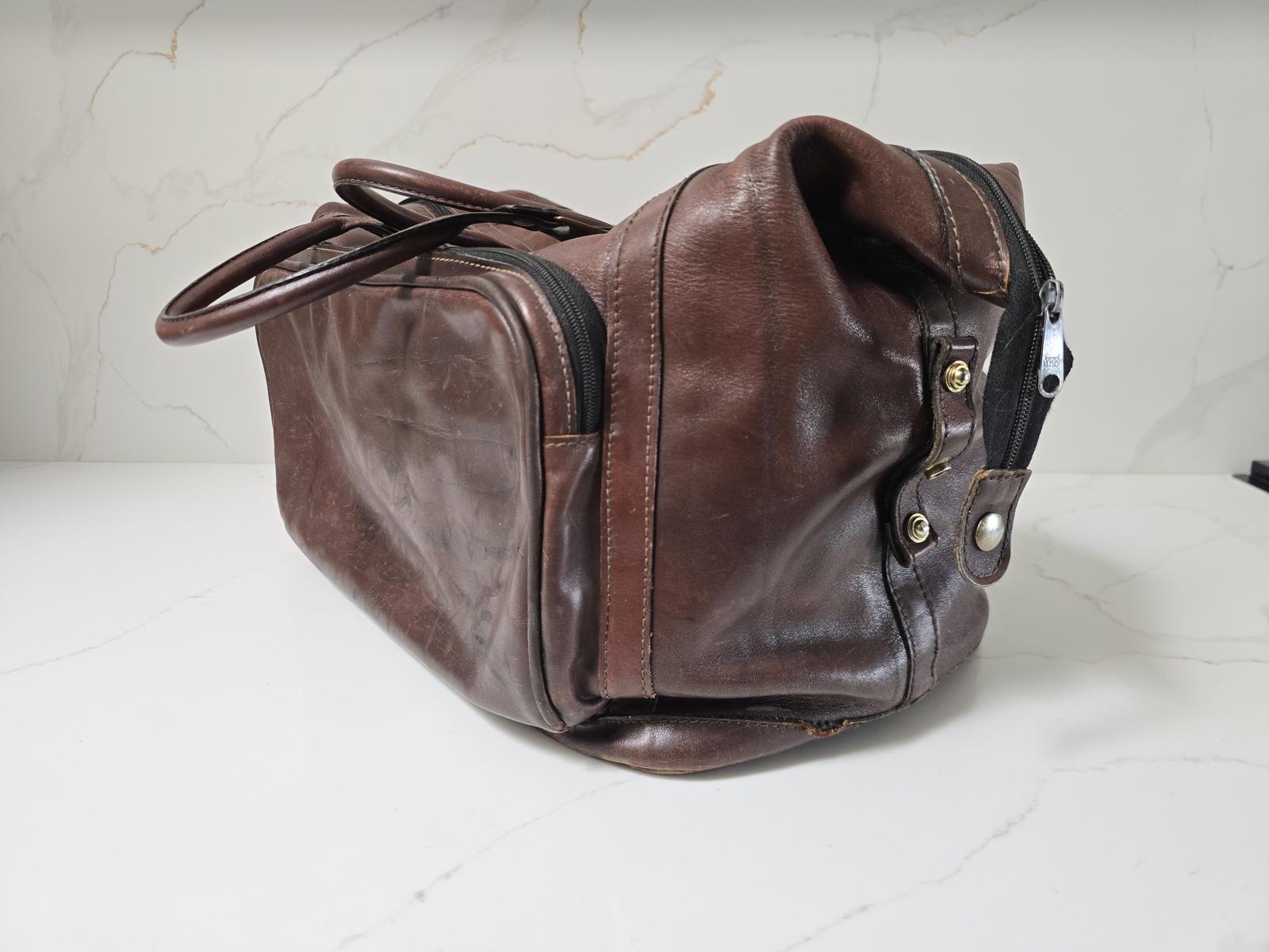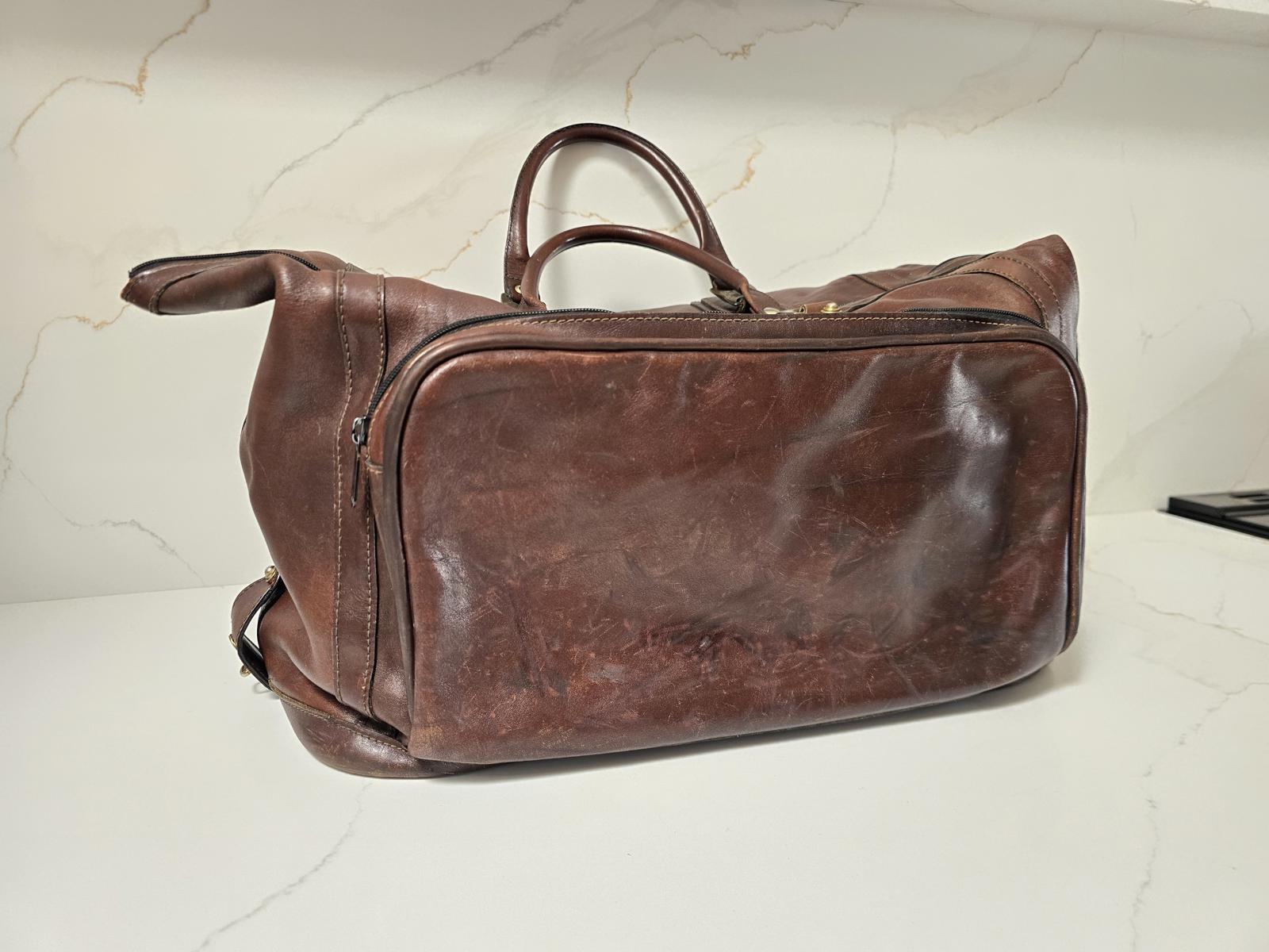 Brics genuine all-leather duffel with outside roomy zip compartment and adjustable snaps to adjust the size. Does show some miles of travel but it has a great patina from age and use. Please check photos. 17"L x 10"W x 10"T when compacted.