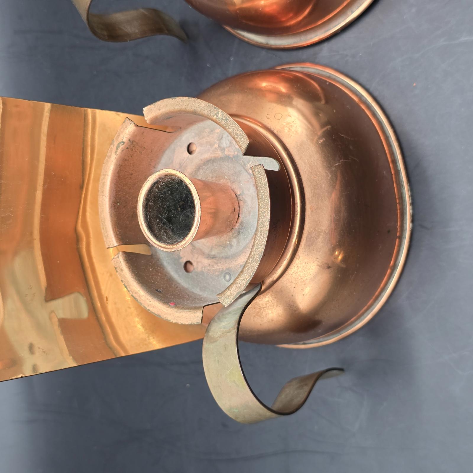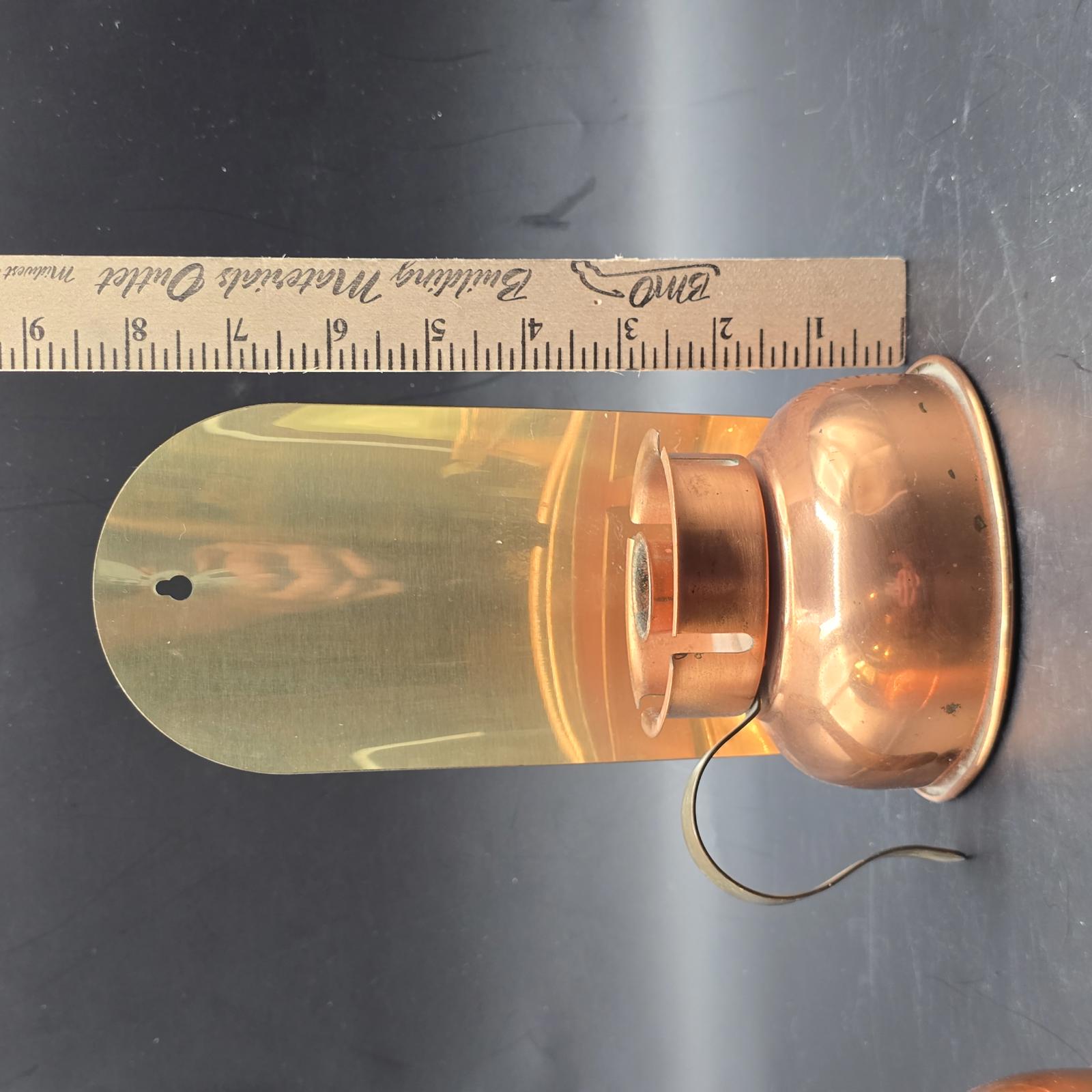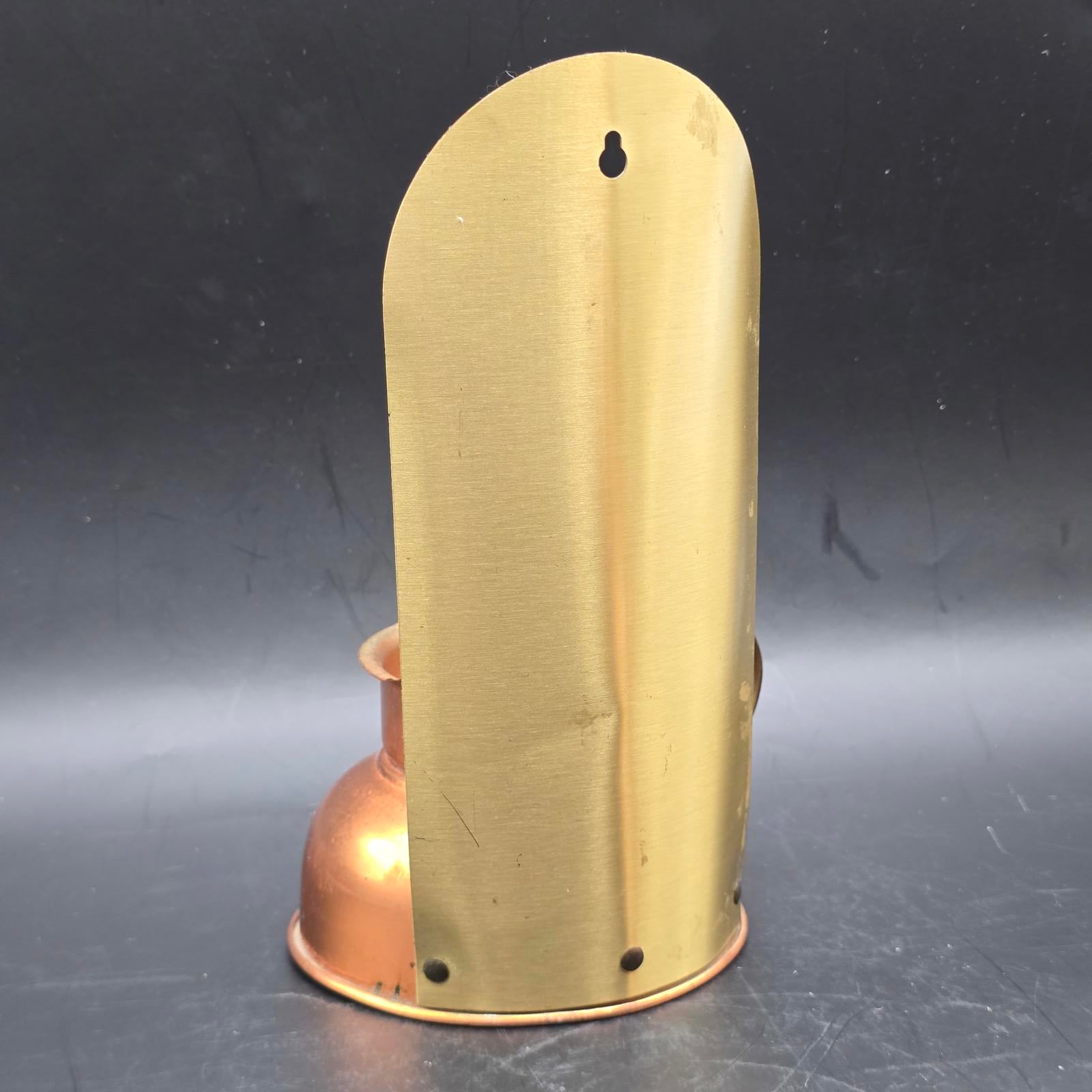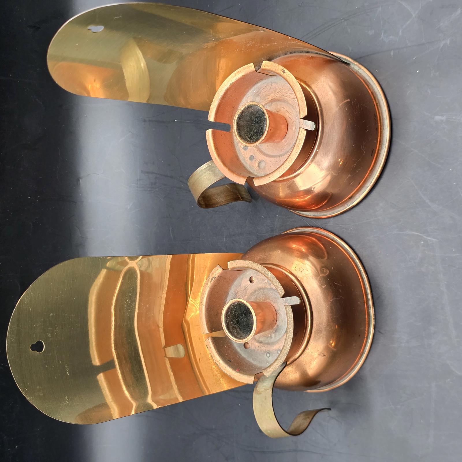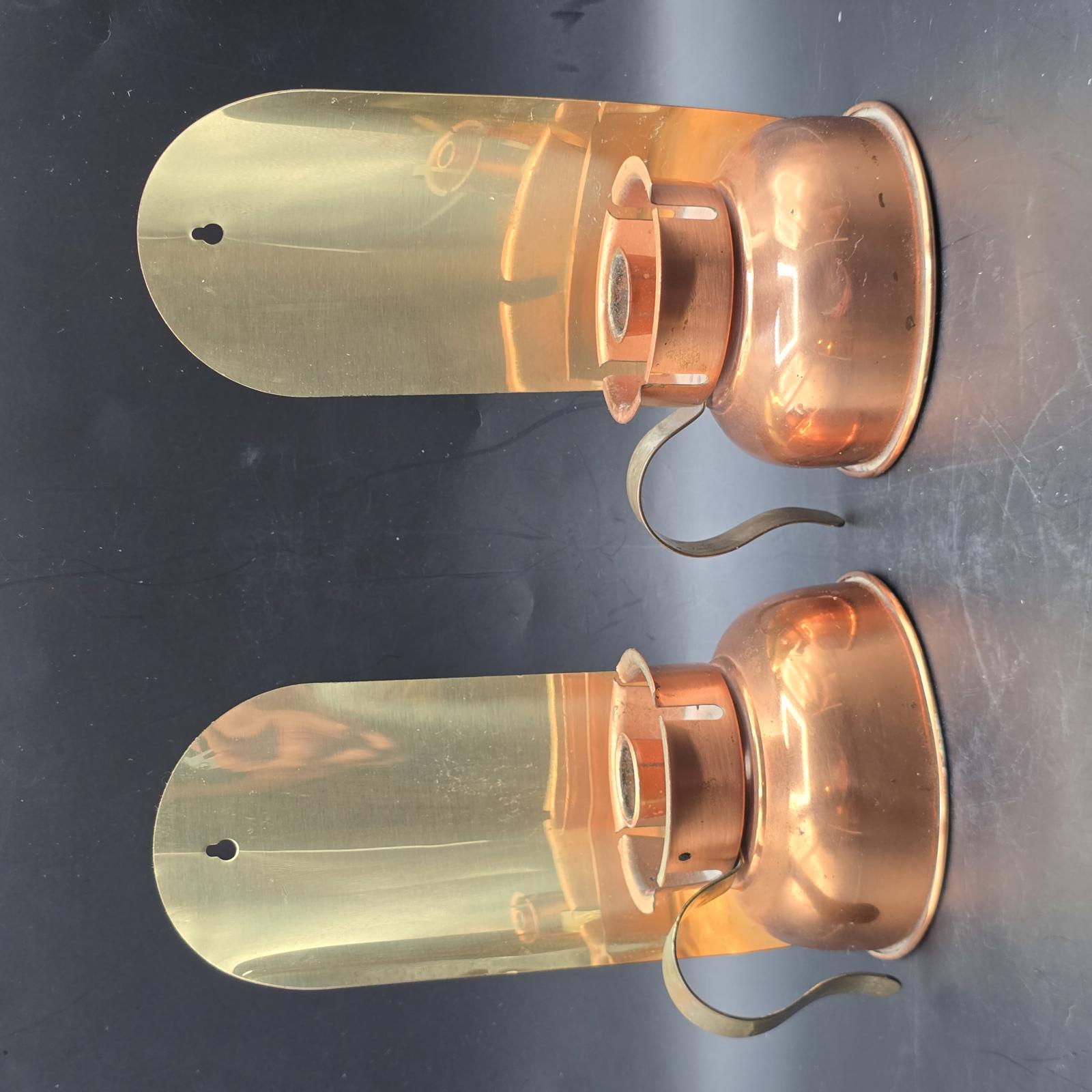 Pair of vintage candle holders that were originally designed to be carried from room-to-room. They can be wall mounted or would look equally terrific flanking a fireplace mantle. Copper body and a polished brass blackplate reflect candlelight beautifully. c.1970's. Made in USA. May have had glass chimneys at one time. Good condition with minimal wear consistent with age and use. Please refer to the photos as they are part of the description. Approximately 8.5"T x 5"W.