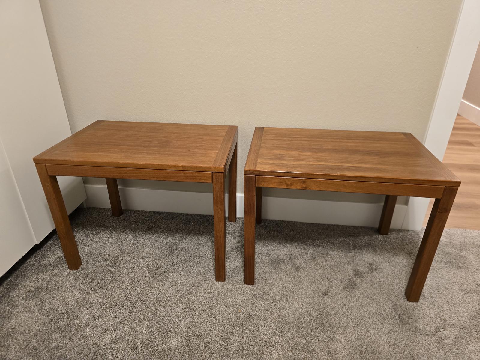 Set of 2 end tables produced in Denmark by Vejle Stole & Mobilfabrik. Light wear consistent with age and use. 17.75" D x 25.5" W x 19.5" T