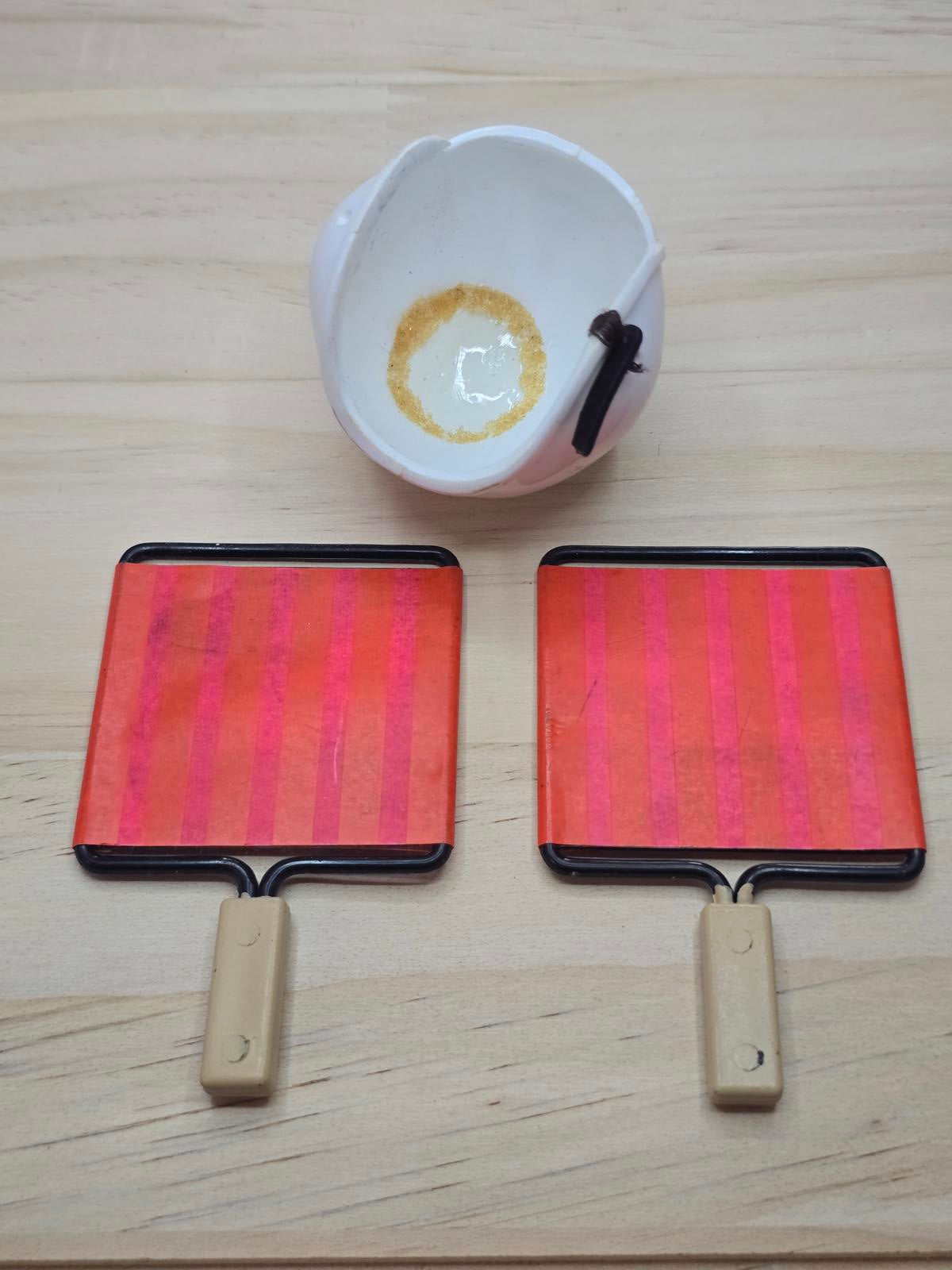 Vintage G.I. Joe Scramble Pilot Flight Suit w/ Helmet and Signal Paddles. Hasbro 1964 and all in great shape. No rips on the paddles but some slight discoloration. Helmet is missing strap and lettering is fading some. Suit is in great shape with some loose stitching but no rips or tears in the fabric.