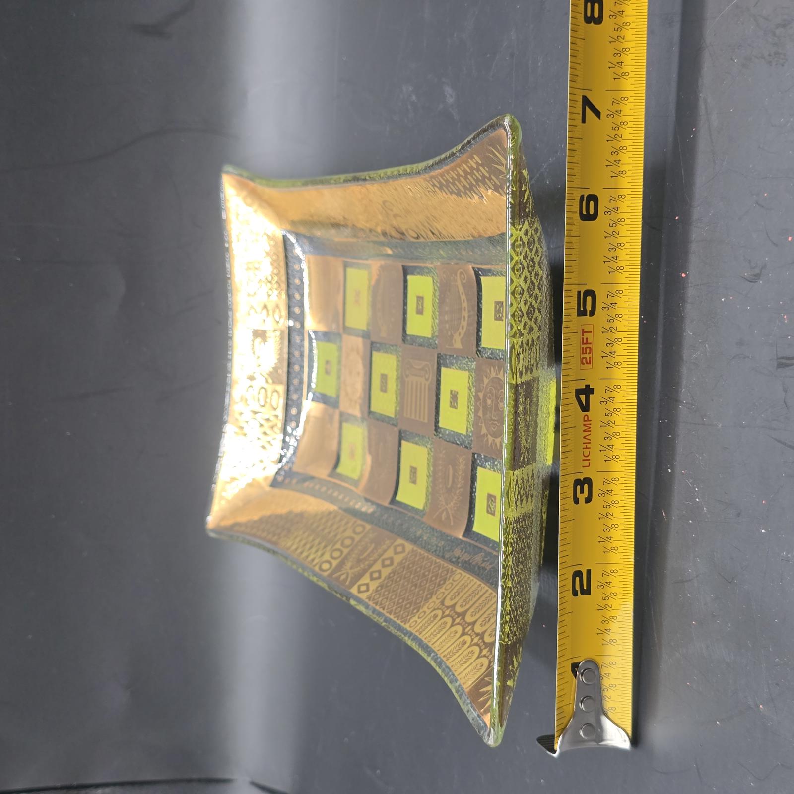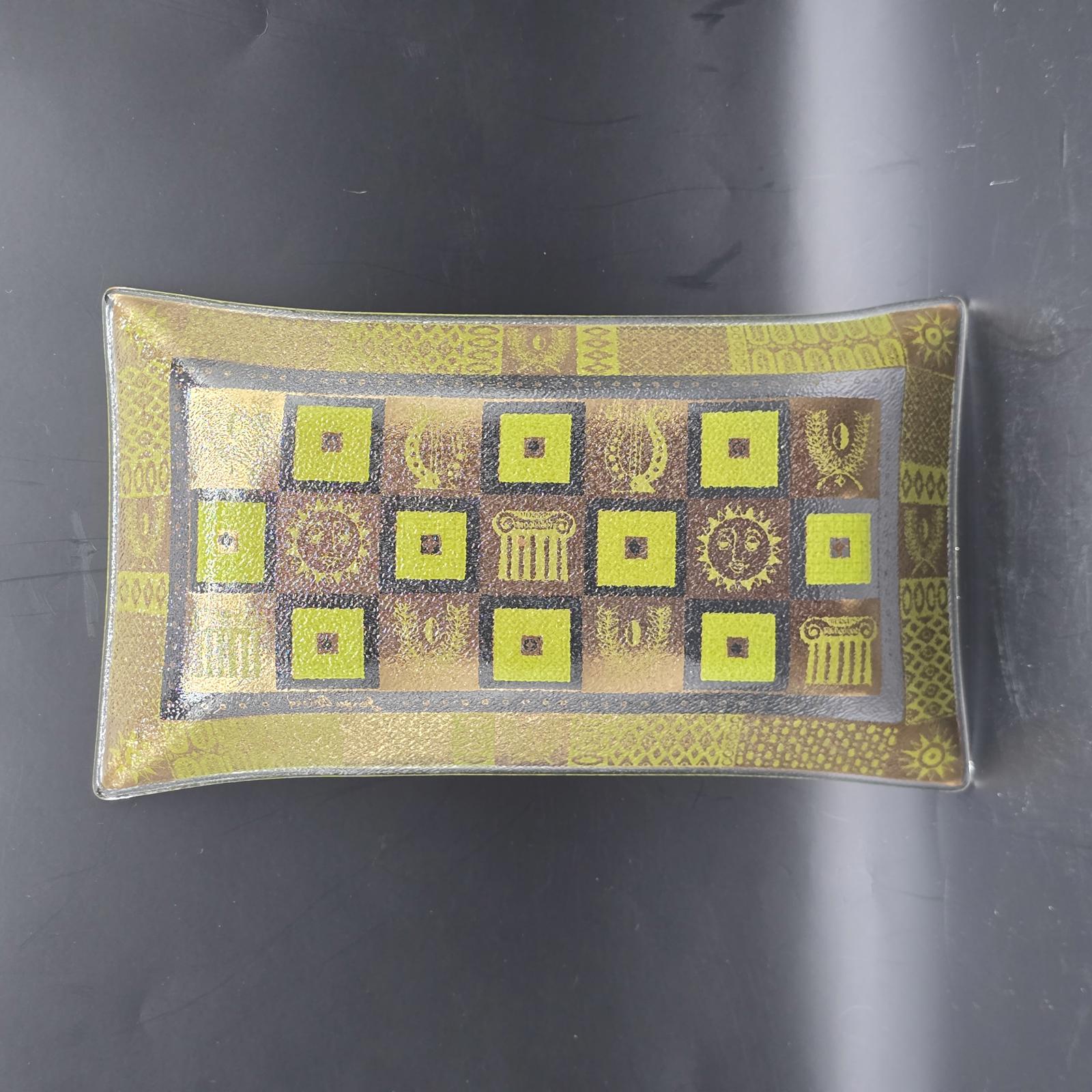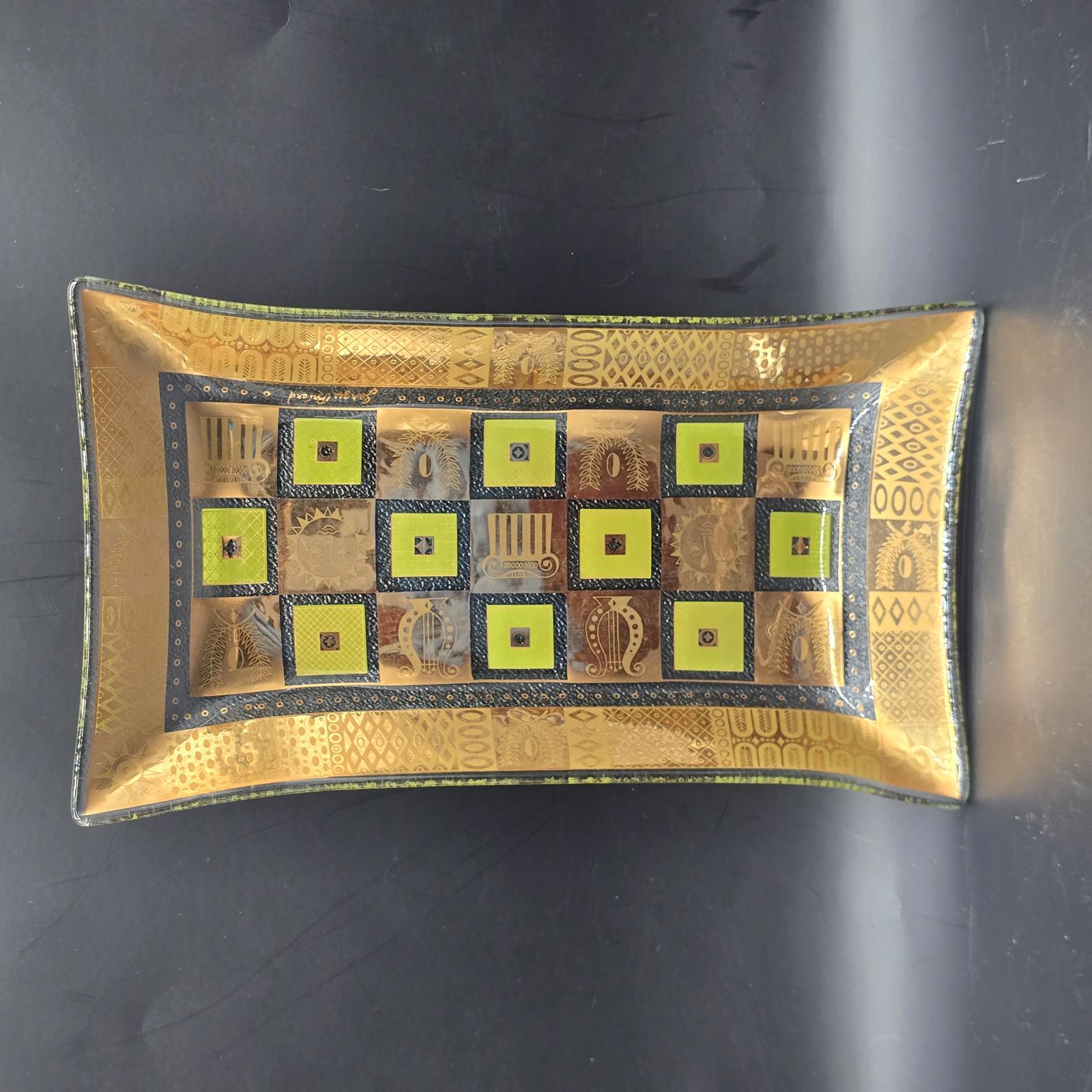 Classic 1950's-1960's signed George Briard glass tray. Use for entertaining, a vanity tray, console tray, or a trinket dish. The Celeste rectangular tray features classical Greco-Roman symbols with 22k gold and fabulous green enamel. 6.75" x 11.5". Hand washing recommended.