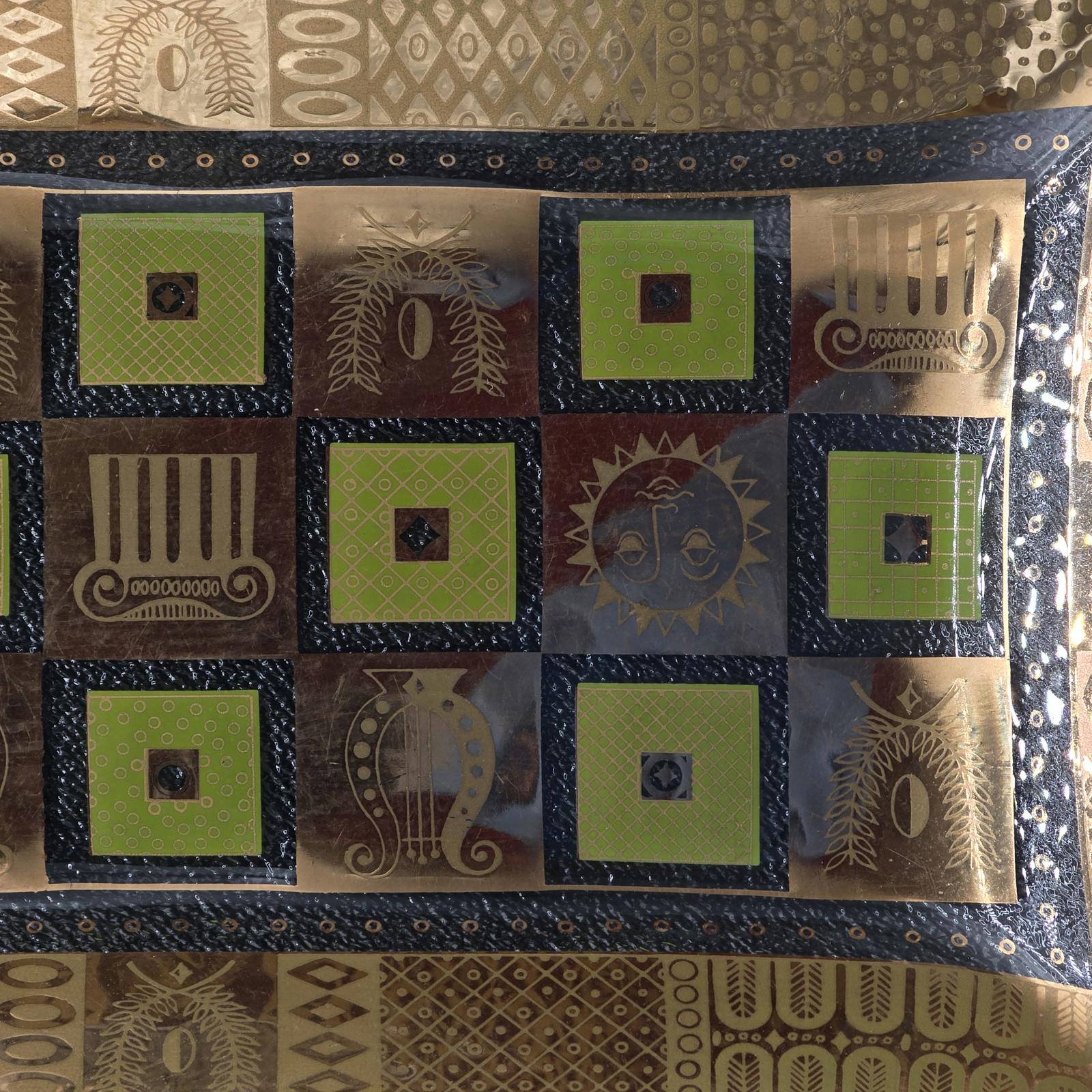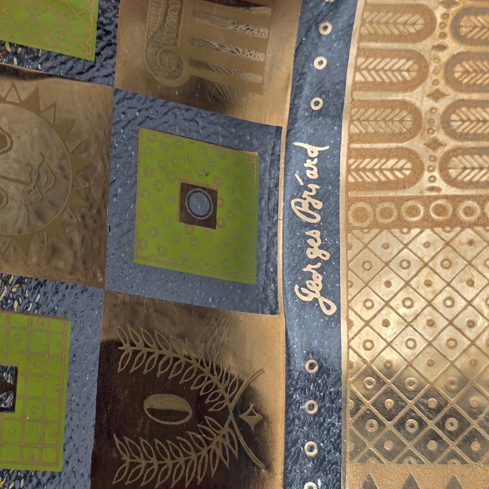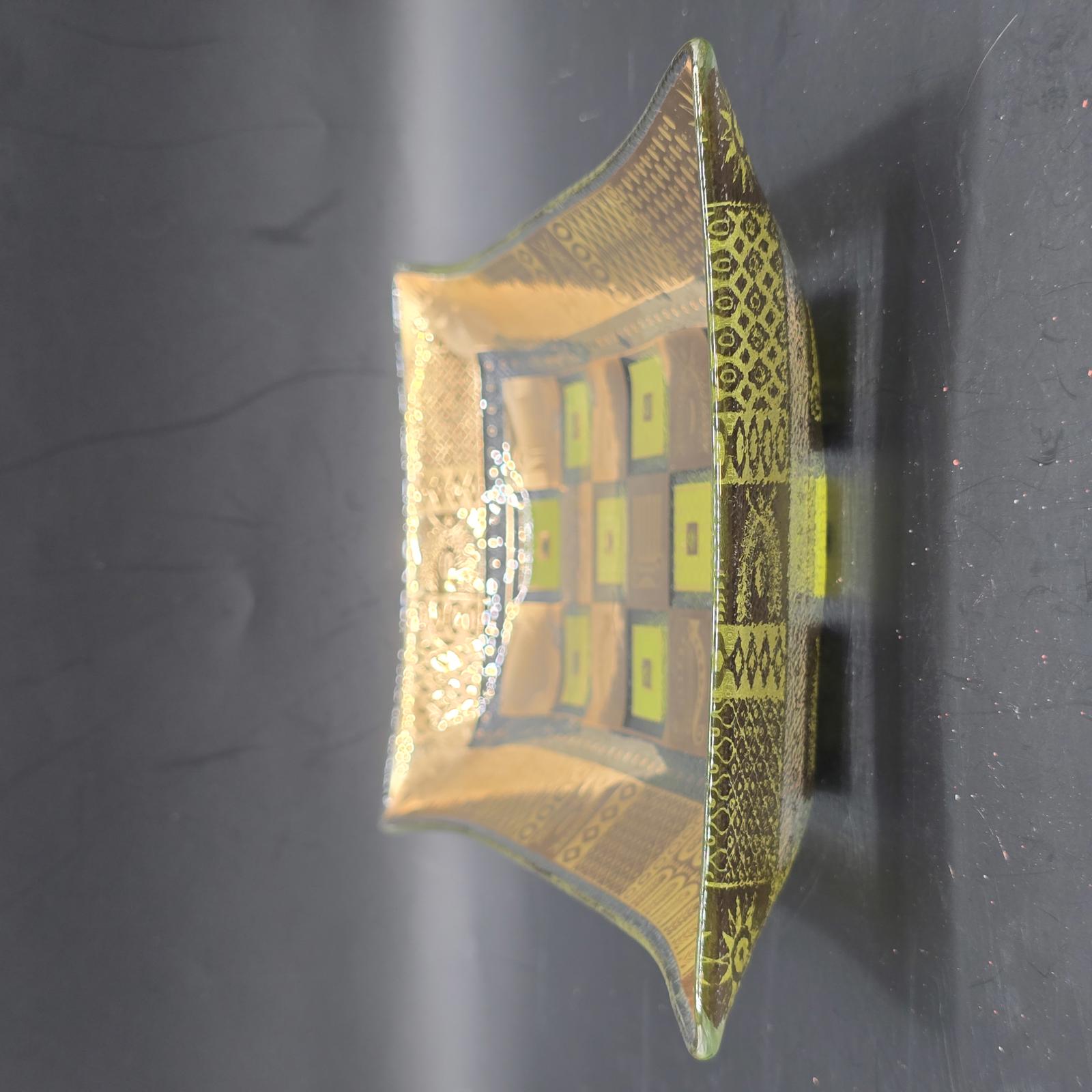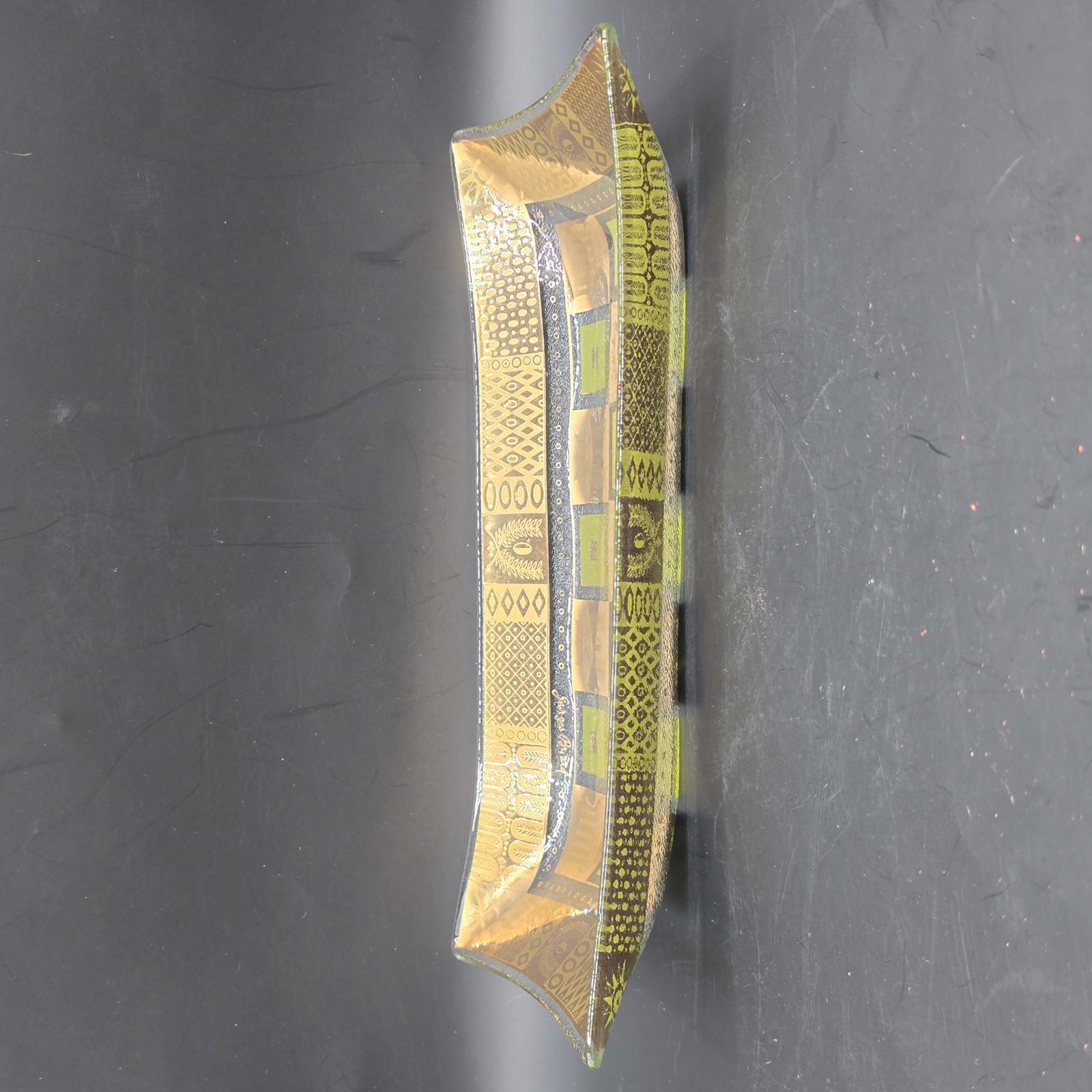 Classic 1950's-1960's signed George Briard glass tray. Use for entertaining, a vanity tray, console tray, or a trinket dish. The Celeste rectangular tray features classical Greco-Roman symbols with 22k gold and fabulous green enamel. 6.75" x 11.5". Hand washing recommended.