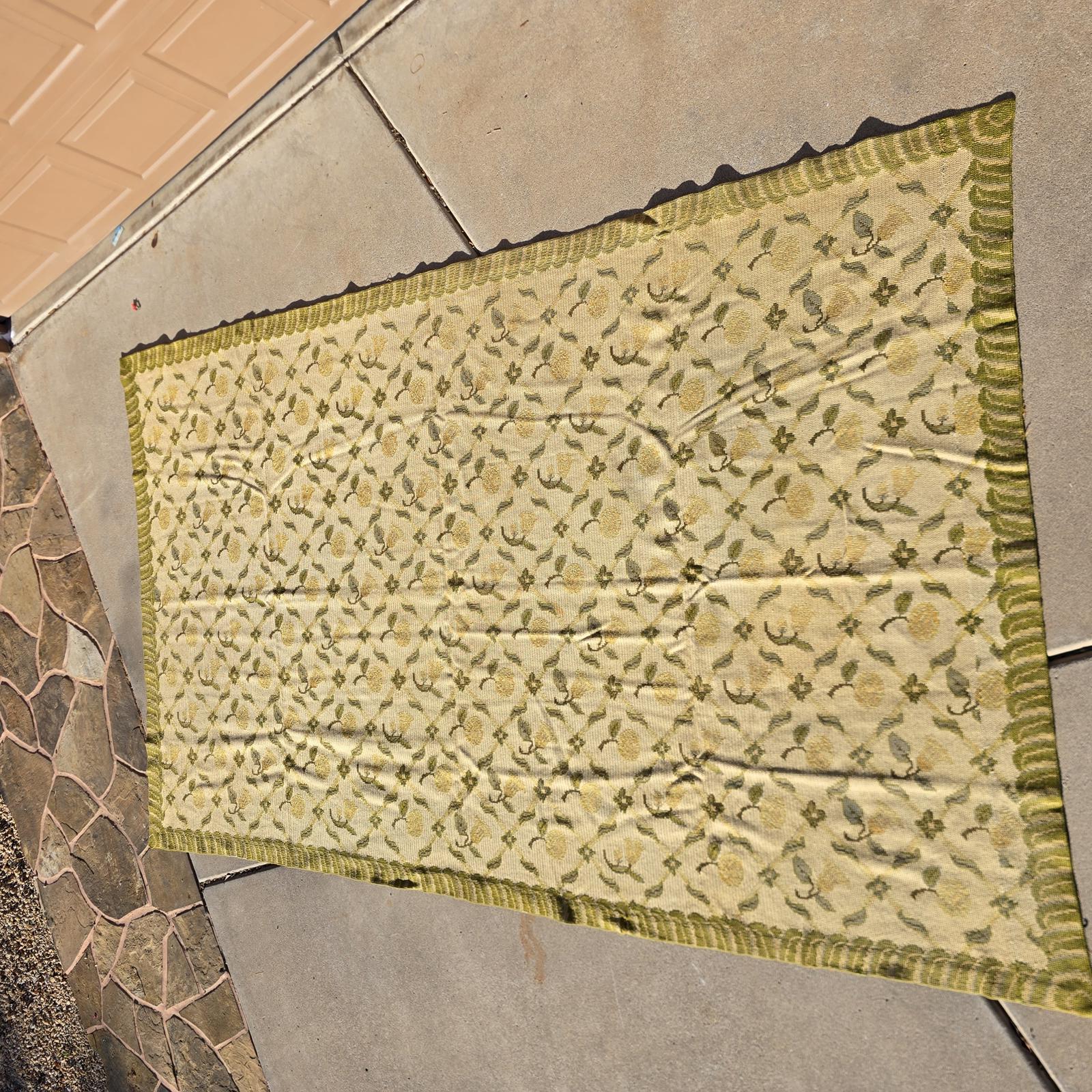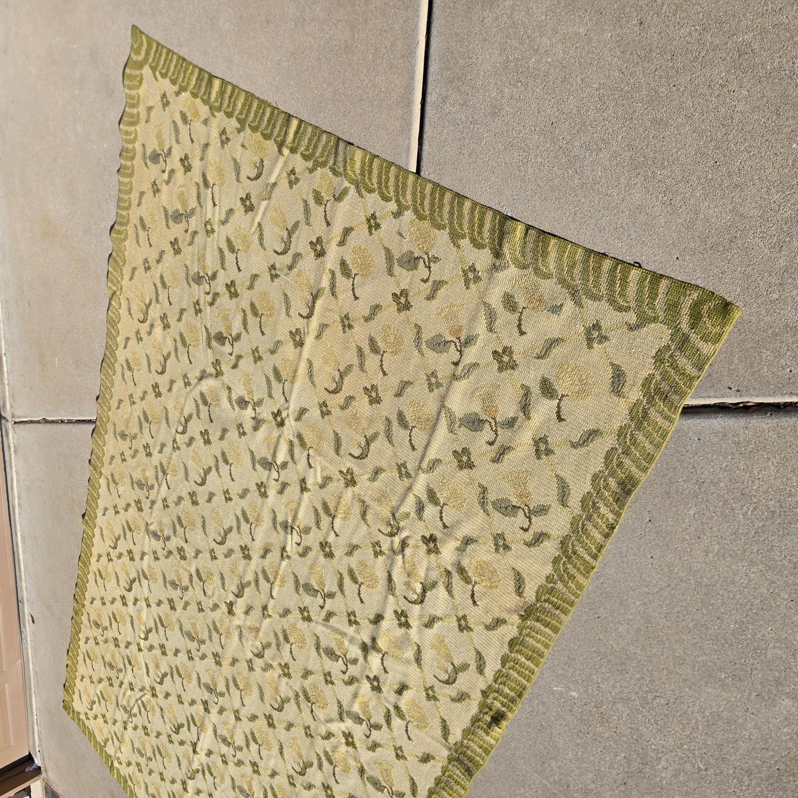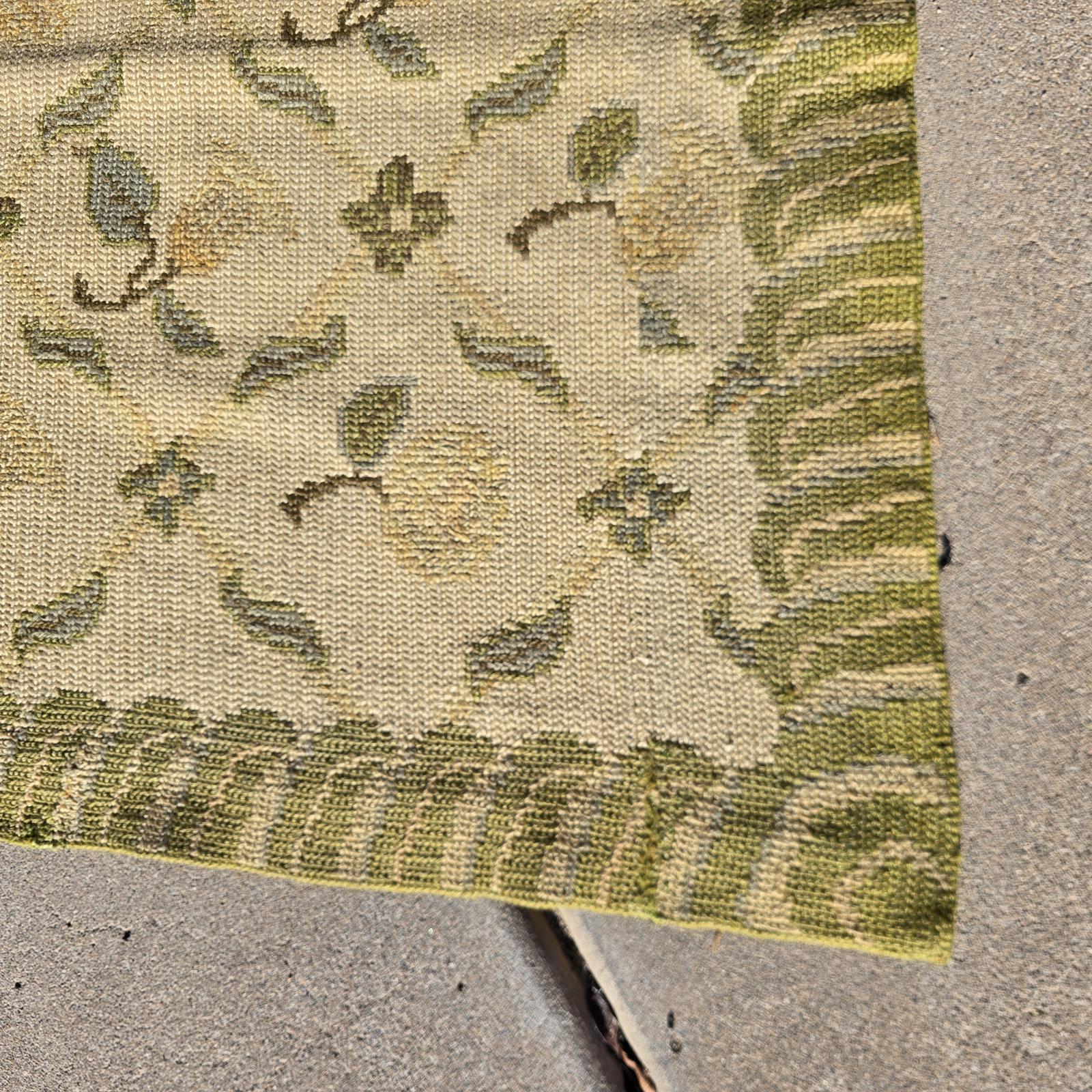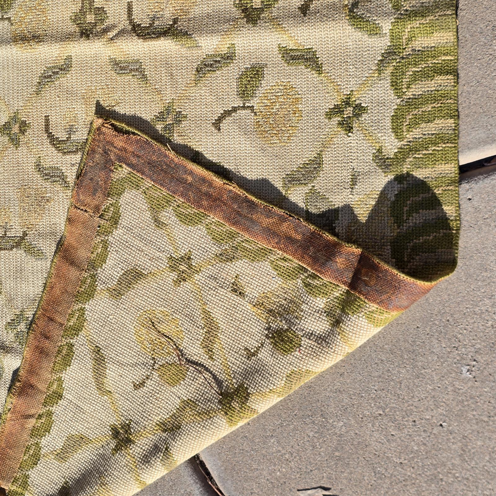 Bring the garden and the outdoors in, with this high quality, hand-crafted French style rug. Beautifully needlepointed flowers and leaves in shades of green and cream are timeless and will complement your decor. The rug measures 11'8"x 6'10" and is bordered on all 4 sides. The back of the rug is hand-bound and cleanly finished, although it is showing age. High quality and good condition with the subtle imperfections only hand-crafted rugs possess and wear consistent with age and use. Vintage rug so would recommend cleaning to freshen and help alleviate creases from being folded in storage. Rug pad recommended. Please refer to photos for condition, as they are part of the description. Check my listing for the smaller version of this rug which is also available.