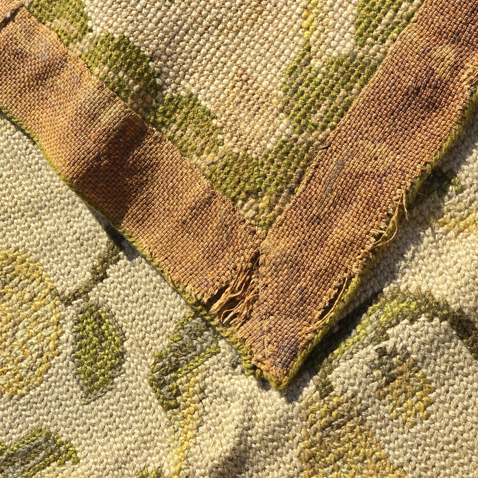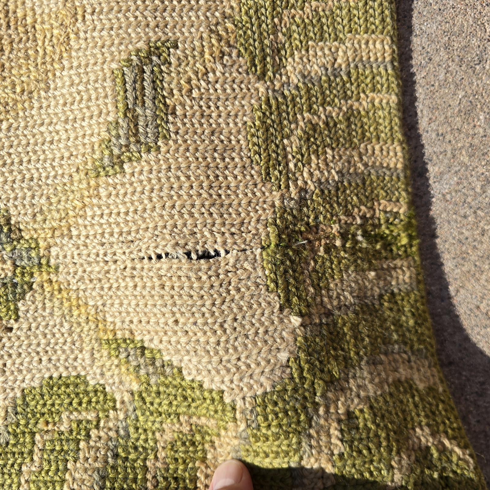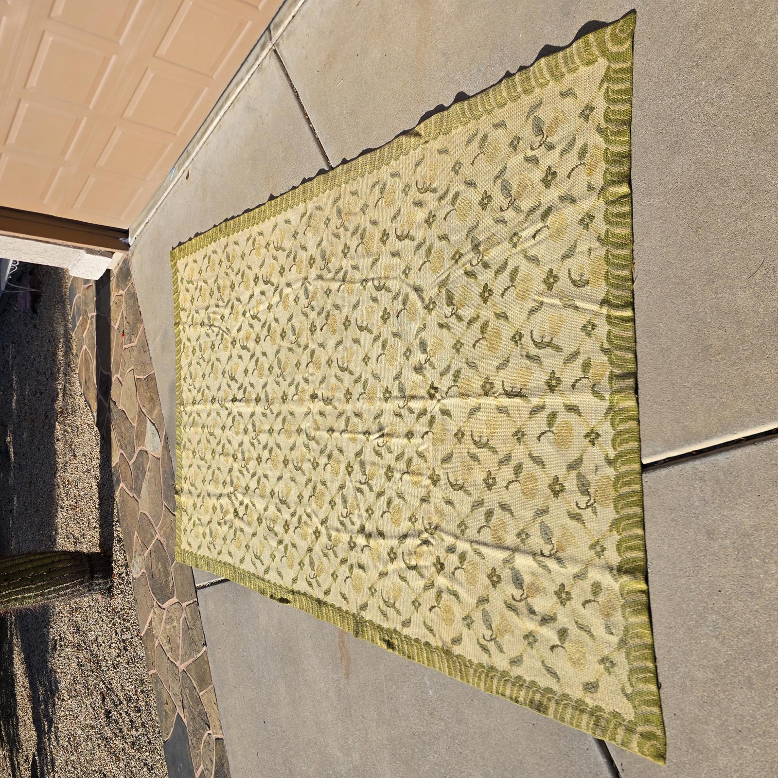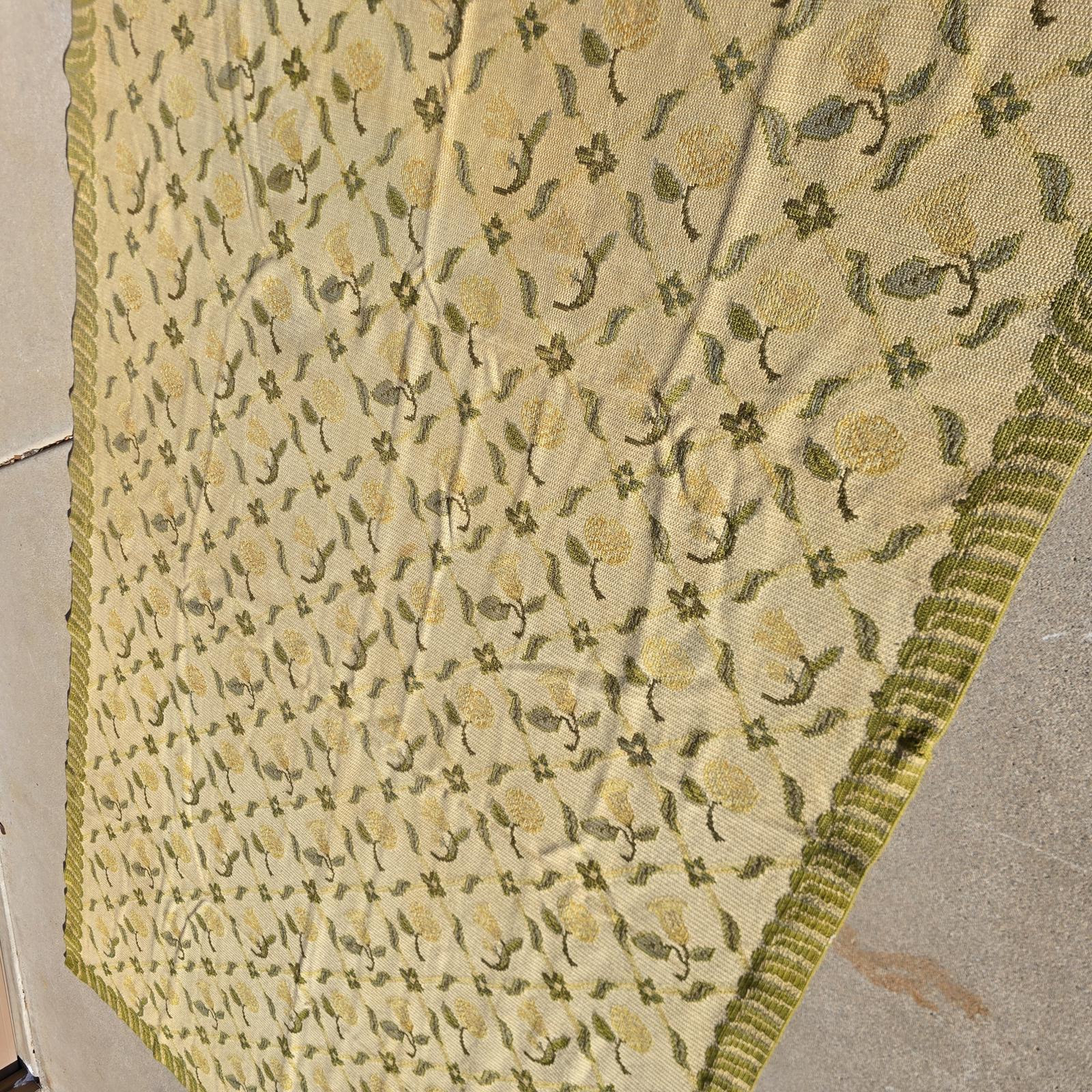 Bring the garden and the outdoors in, with this high quality, hand-crafted French style rug. Beautifully needlepointed flowers and leaves in shades of green and cream are timeless and will complement your decor. The rug measures 11'8"x 6'10" and is bordered on all 4 sides. The back of the rug is hand-bound and cleanly finished, although it is showing age. High quality and good condition with the subtle imperfections only hand-crafted rugs possess and wear consistent with age and use. Vintage rug so would recommend cleaning to freshen and help alleviate creases from being folded in storage. Rug pad recommended. Please refer to photos for condition, as they are part of the description. Check my listing for the smaller version of this rug which is also available.