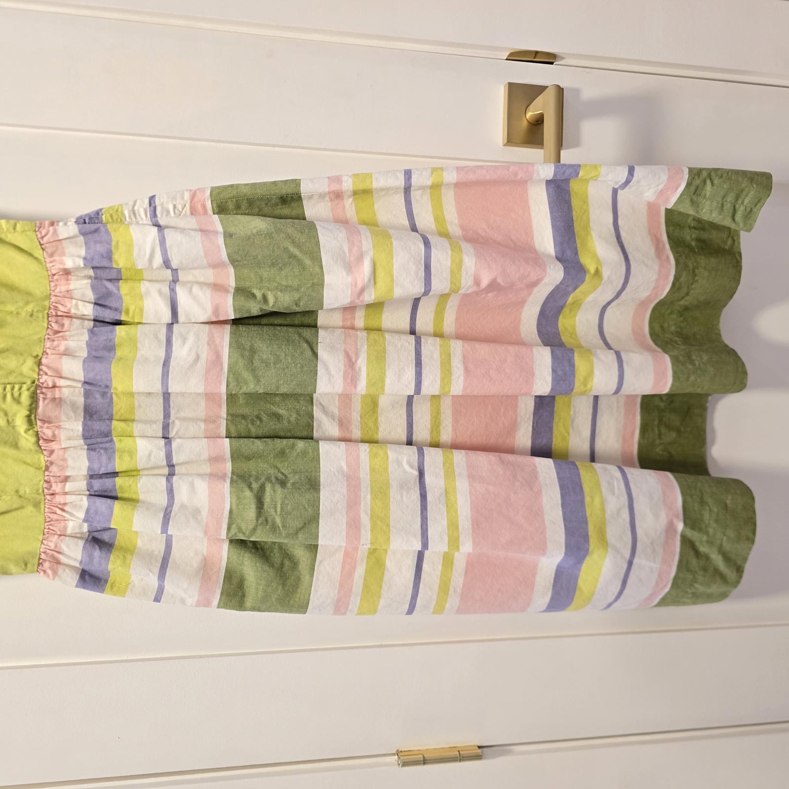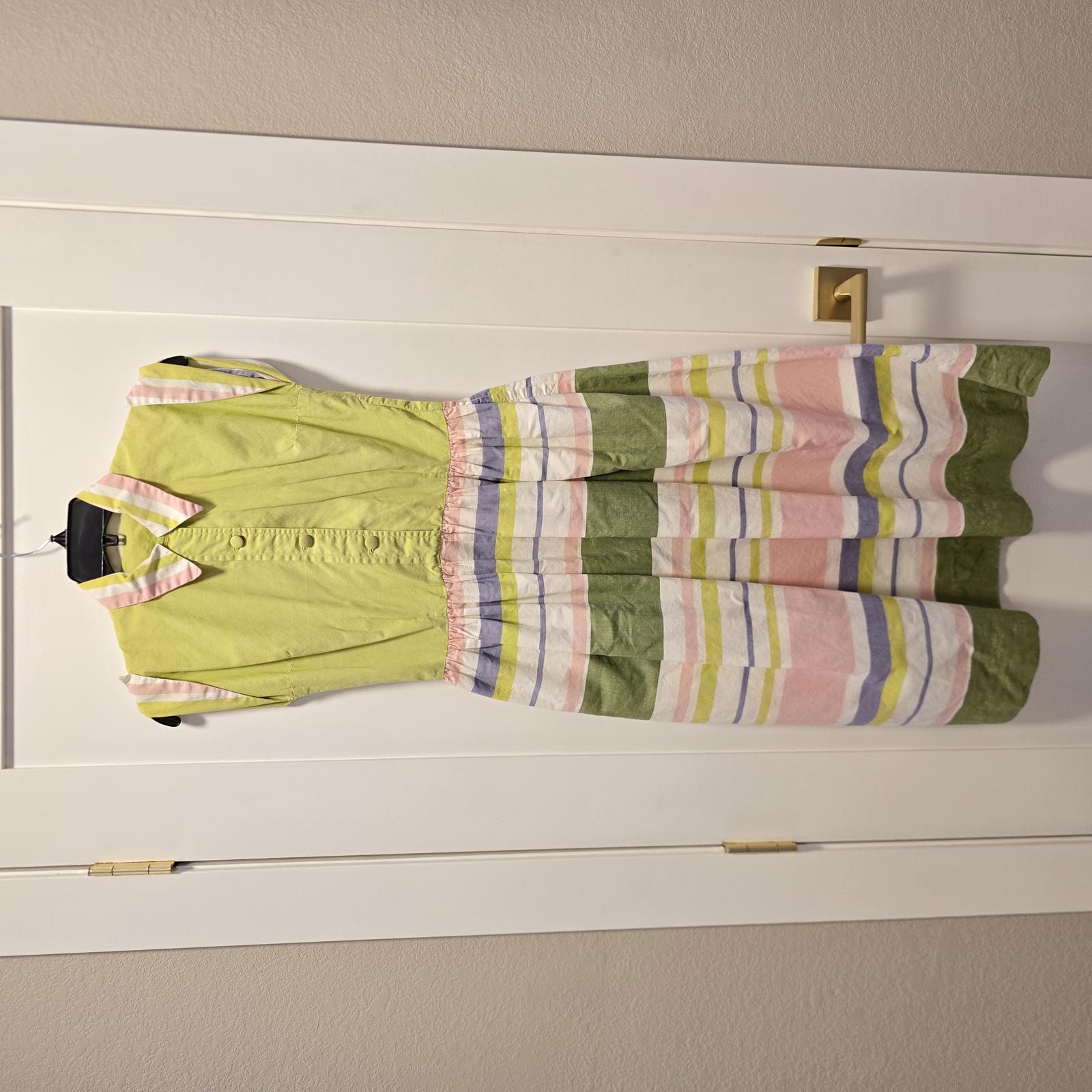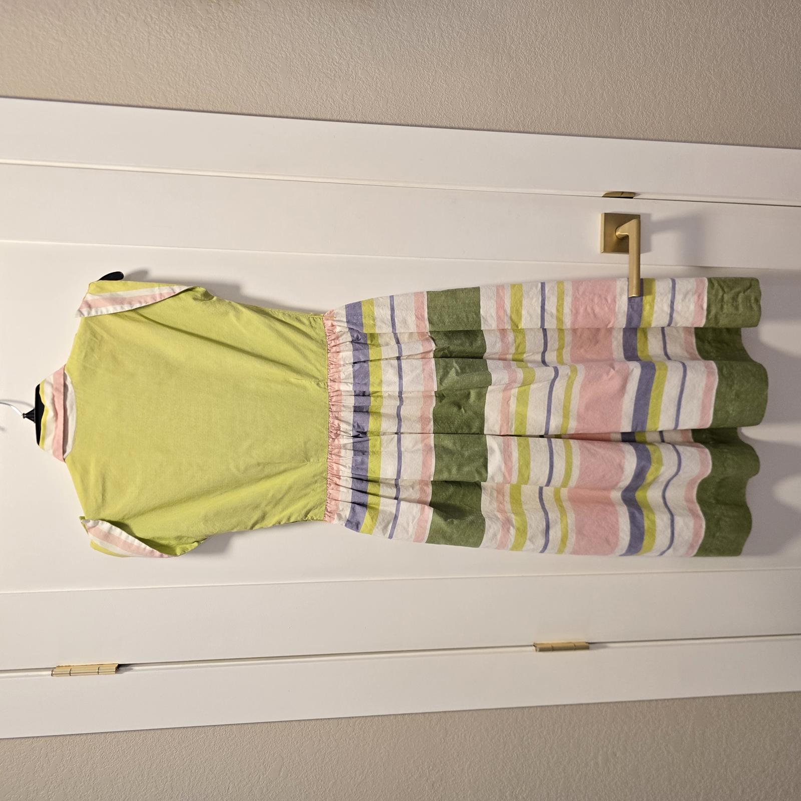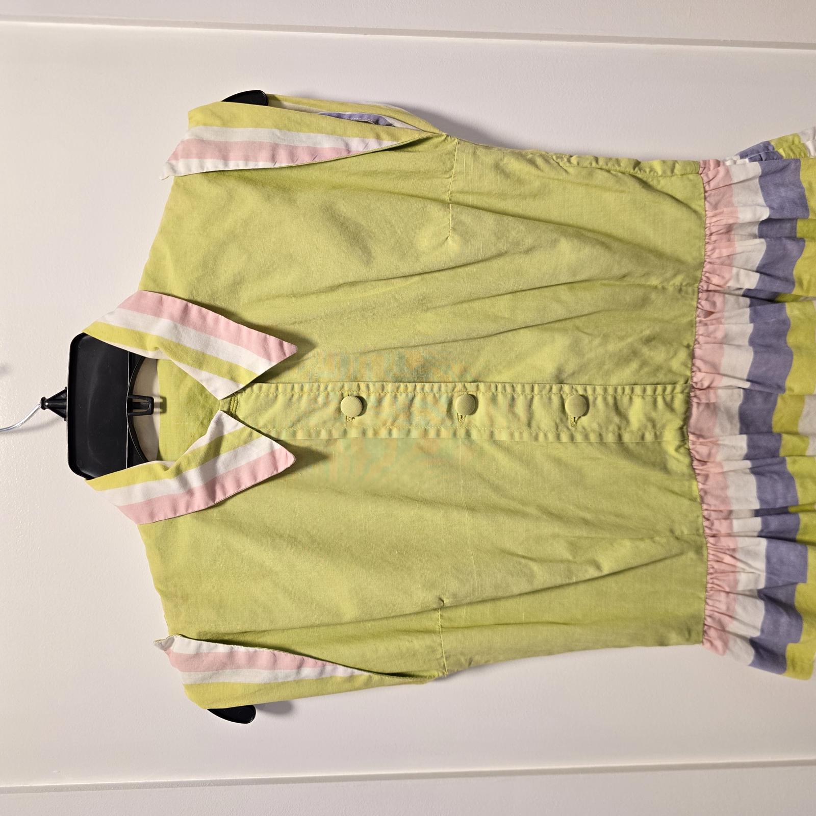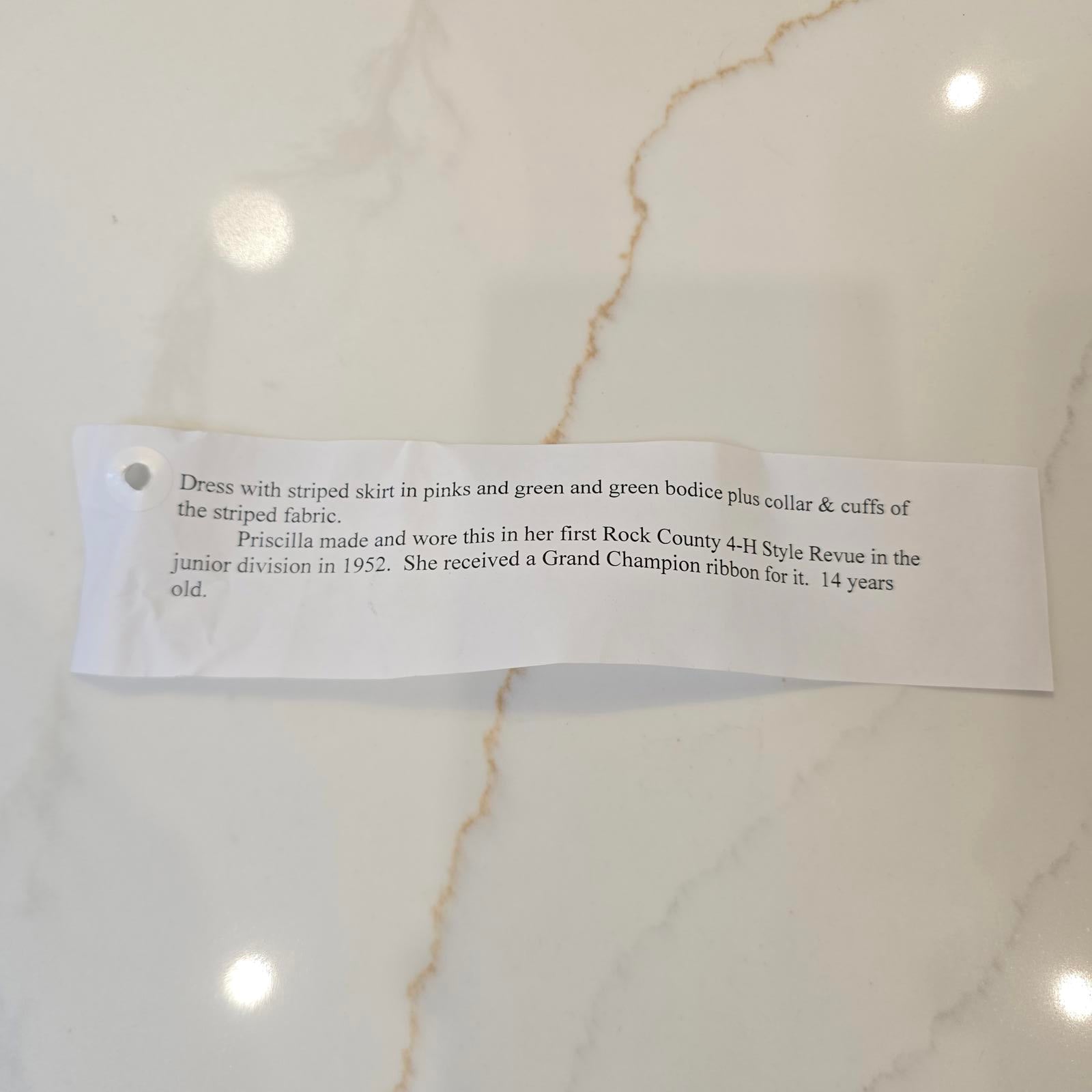 Vintage pink and green striped dress with a separate belt, hand-sewn by Priscilla for the 1952 Rock County 4-H Style Review. Priscilla was 14 years old and received a grand champion ribbon. Small size. Please refer to photos for condition and measurements as they are part of the description.