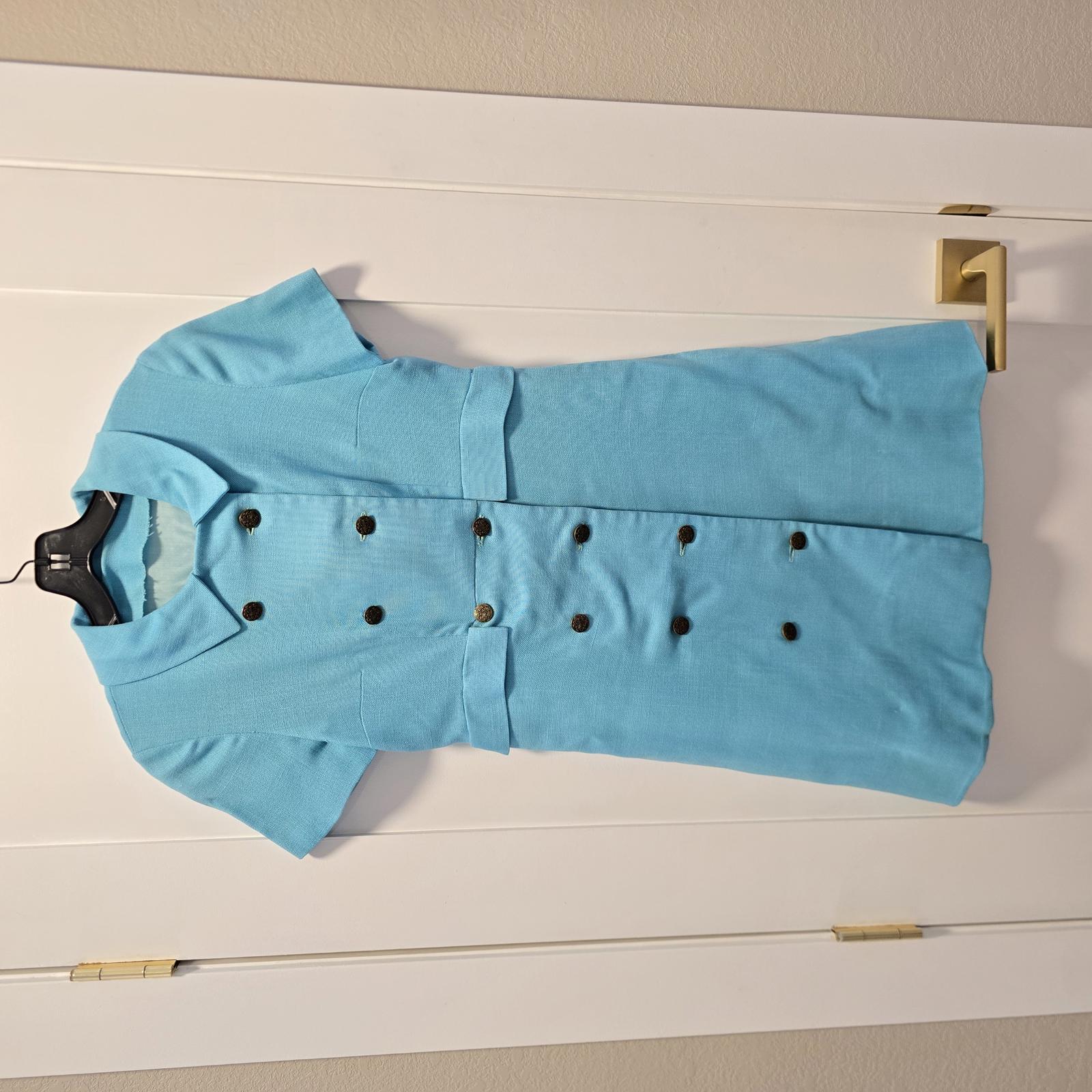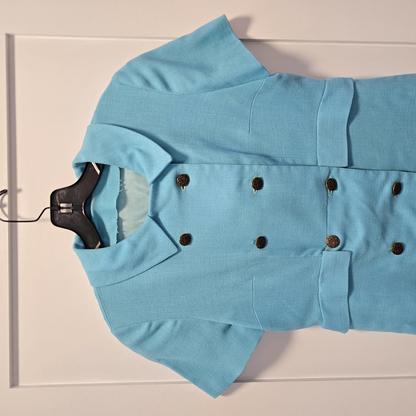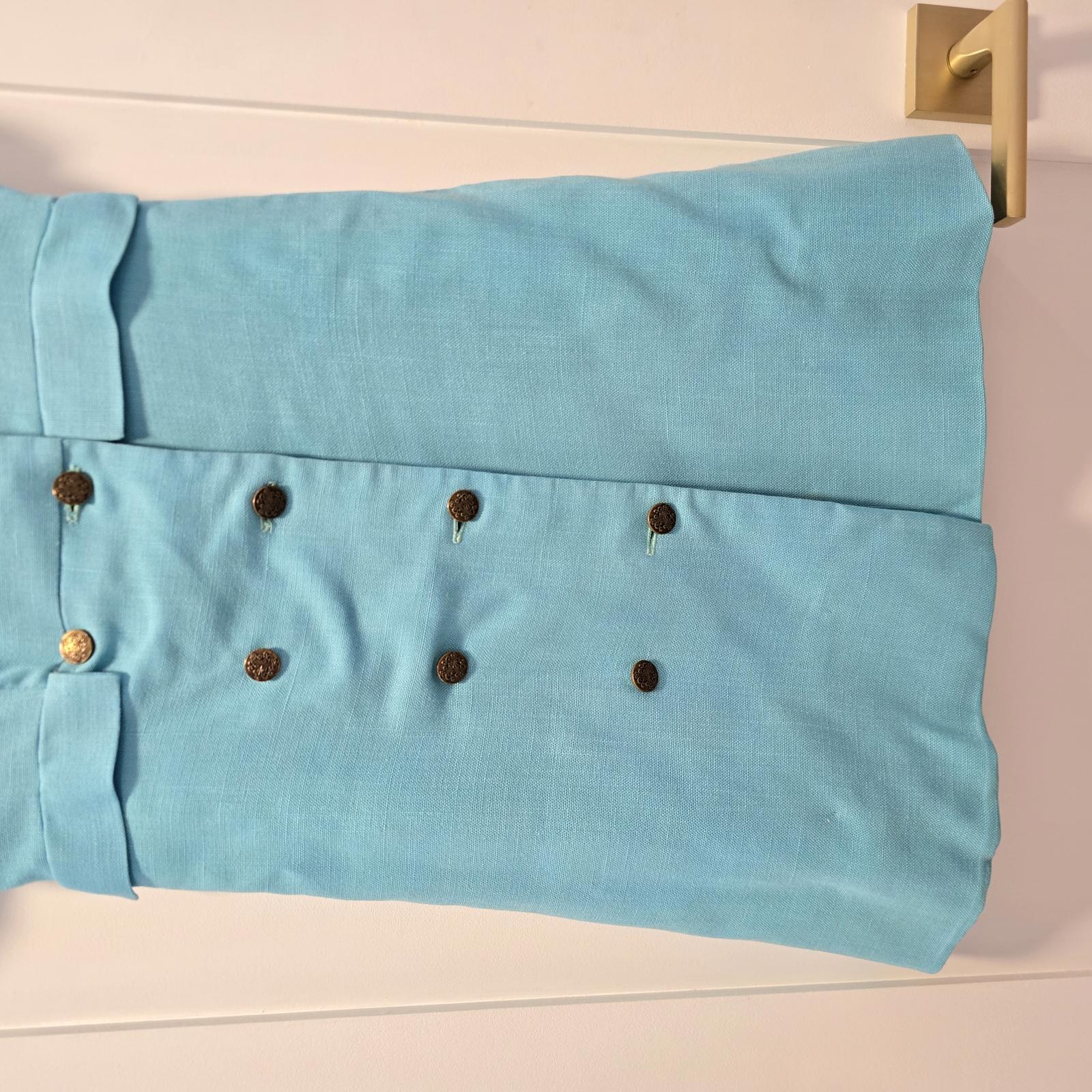 Vintage blue linen-look dress hand-sewn by Priscilla c.1970's. Coat dress style with double brass buttons. Small size. Please refer to photos for condition and measurements as they are part of the description.