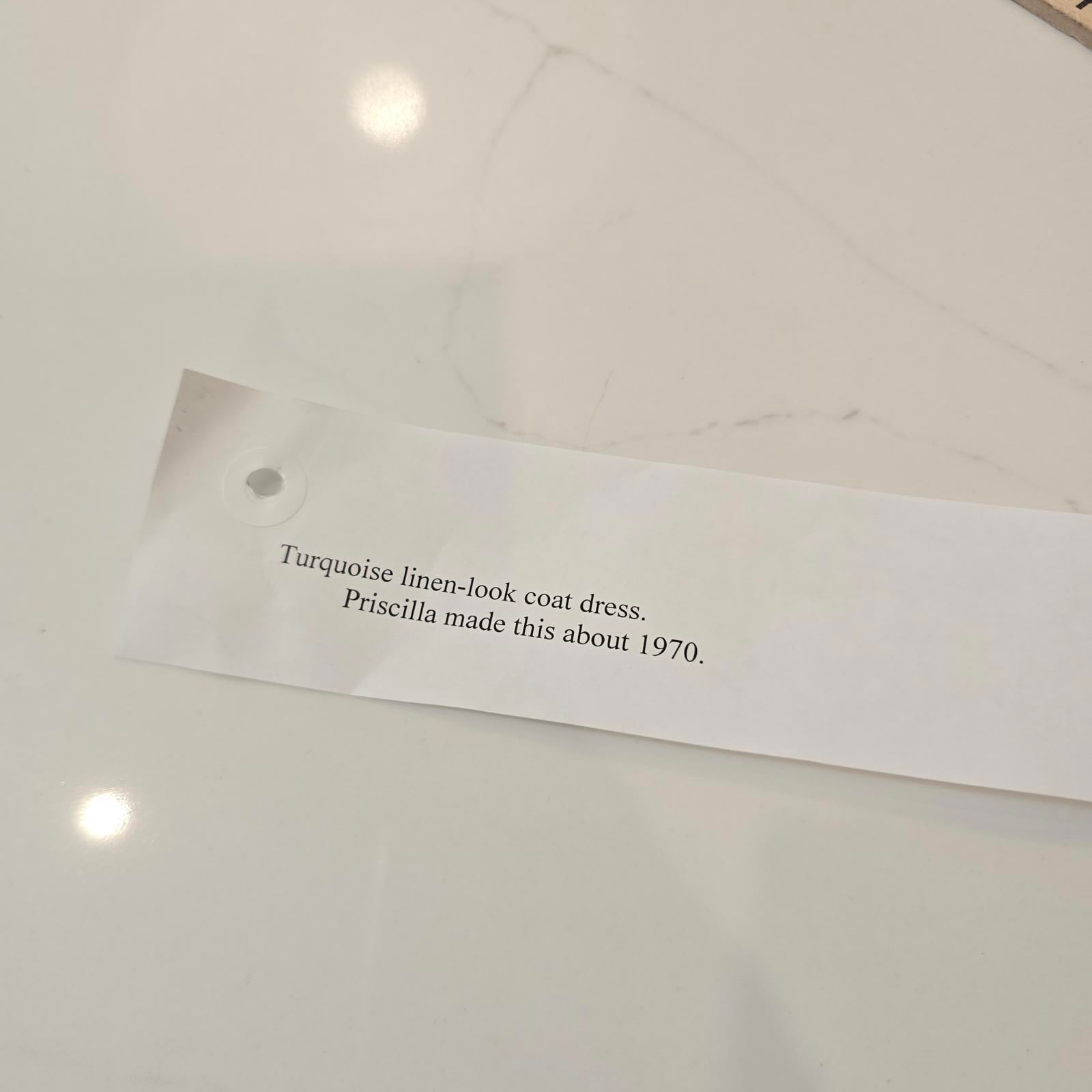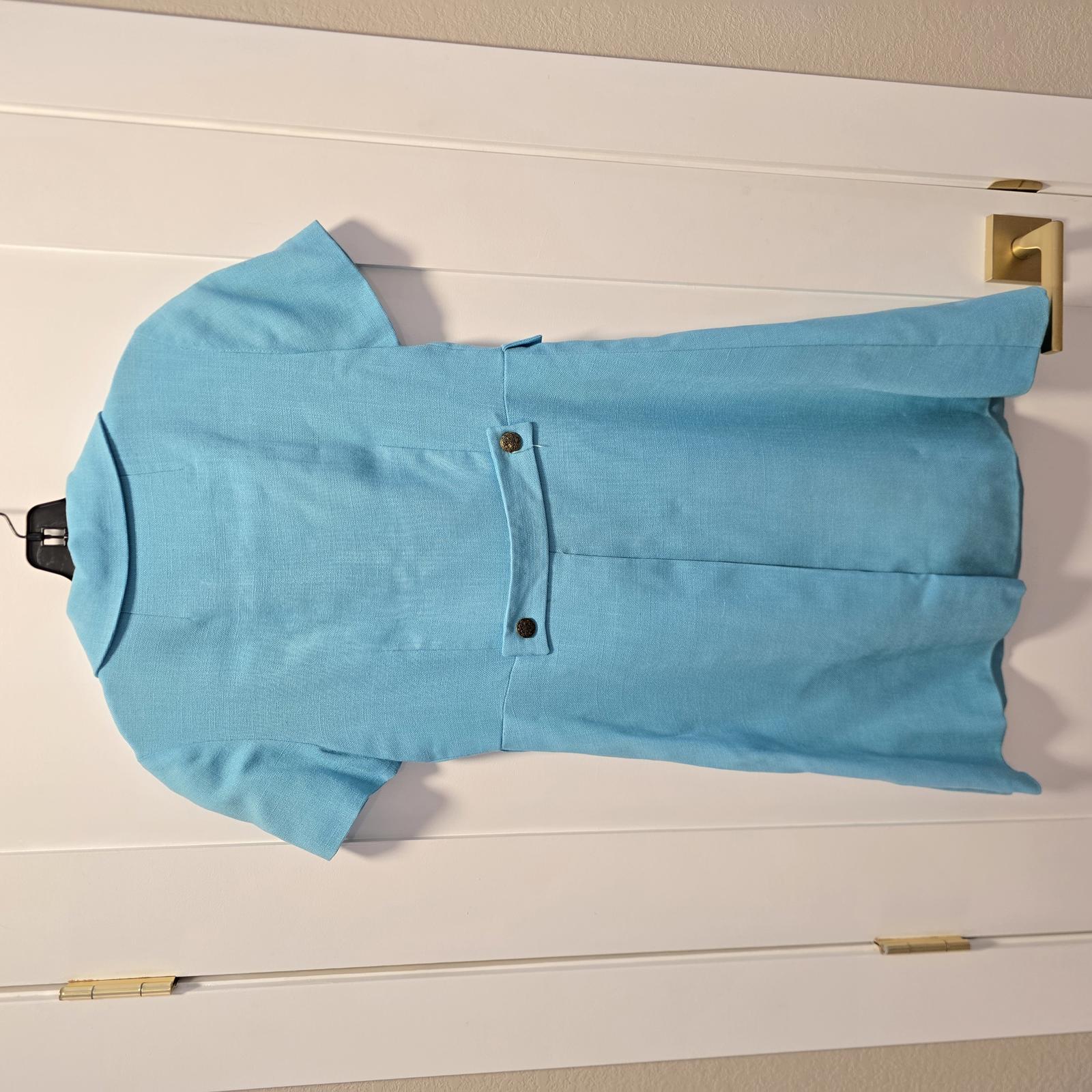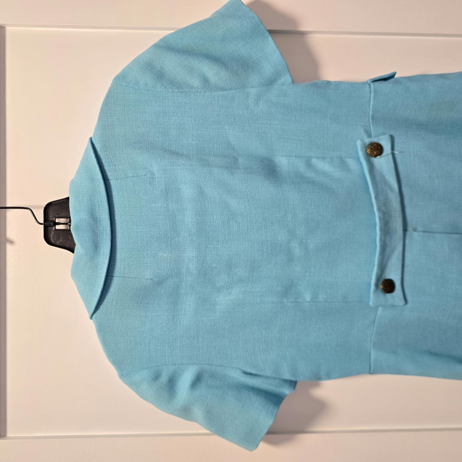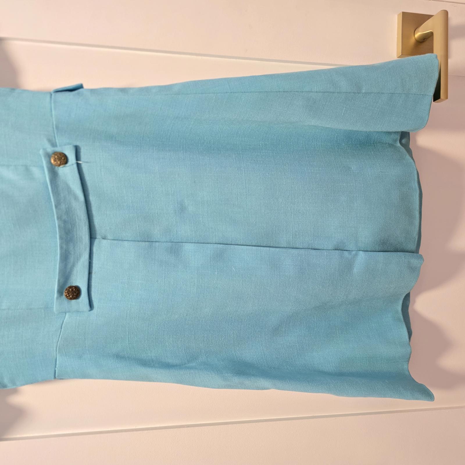 Vintage blue linen-look dress hand-sewn by Priscilla c.1970's. Coat dress style with double brass buttons. Small size. Please refer to photos for condition and measurements as they are part of the description.