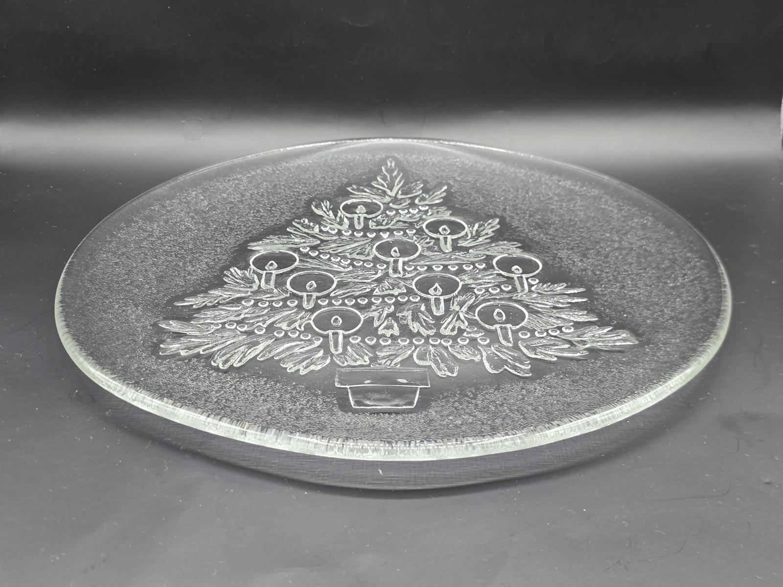 Candle sticks and garland adorn this Christmas tree serving platter surrounded by frosty glass. Good condition with minimal wear consistent with age and use. 2 lb 15 oz