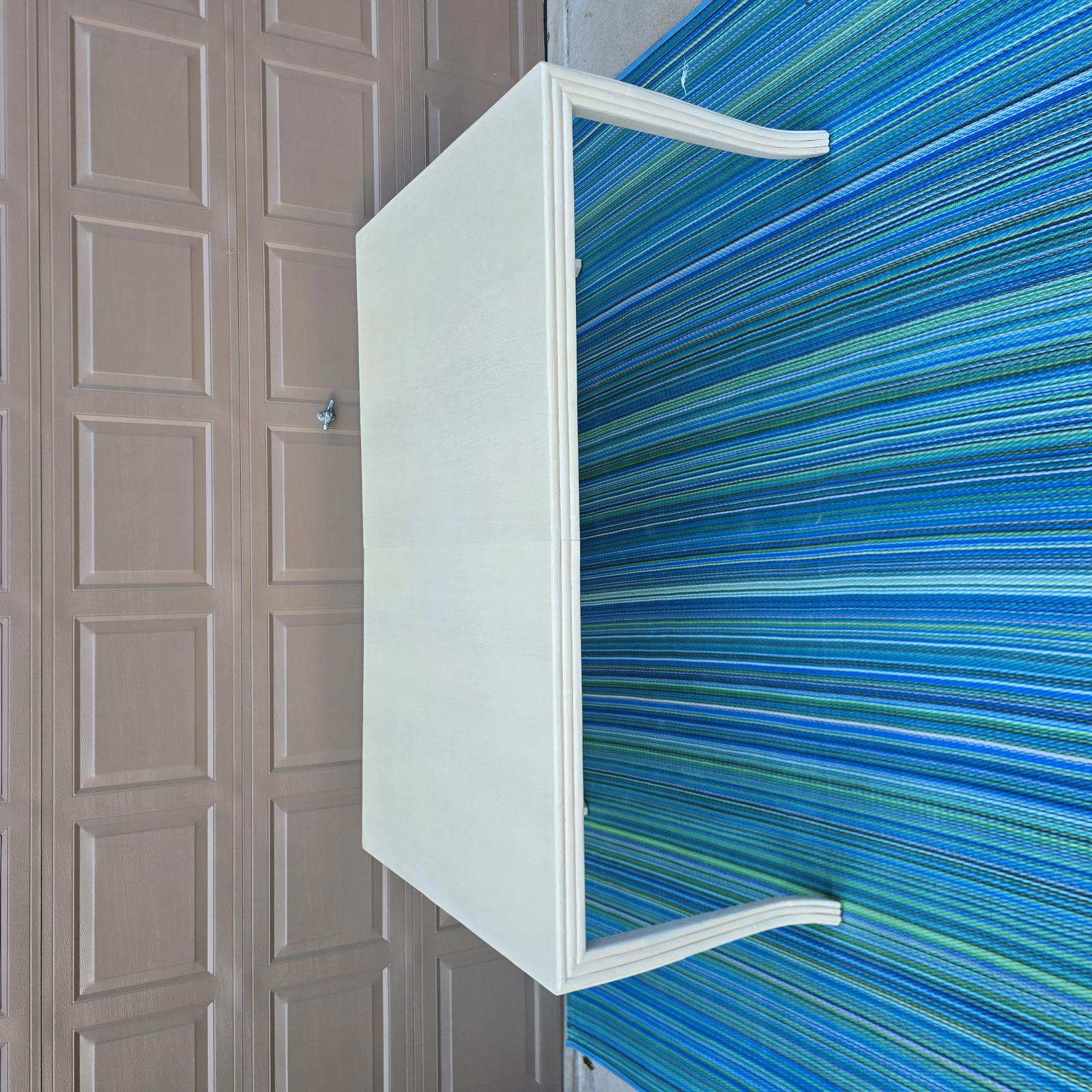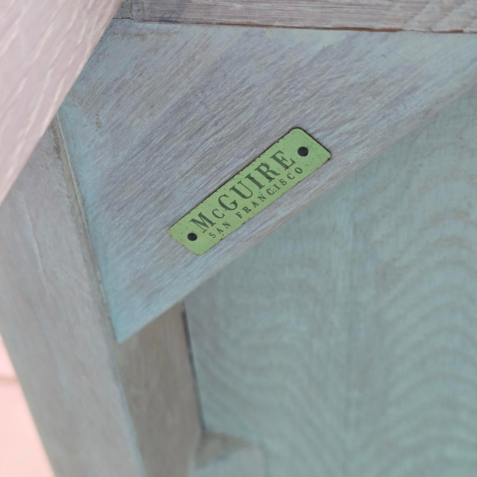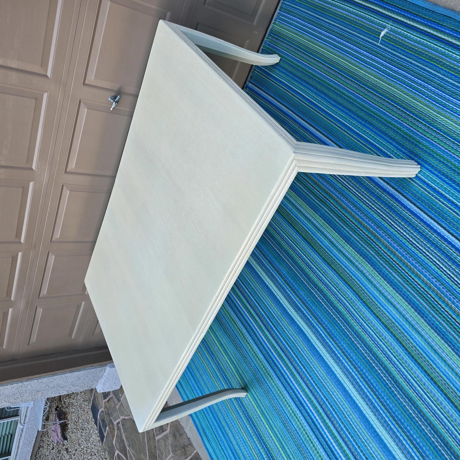 Rare find, McGuire oak dining table with a custom creamy-white finish. The table is framed by a faux-bamboo reeded apron and modern cabriole legs which give it that extra flair and timeless style. Perfect in a Coastal, Hollywood Regency, or Transitional setting. The McGuire San Francisco nameplate is attached underneath the table. Good condition with minimal wear consistent with age and use. Small white spot on table top. The table has a bracket underneath to hold 2 sides together. It does not open or extend. Please refer to photos as they are part of the description. 73"L x 46"W x 30.25"H.