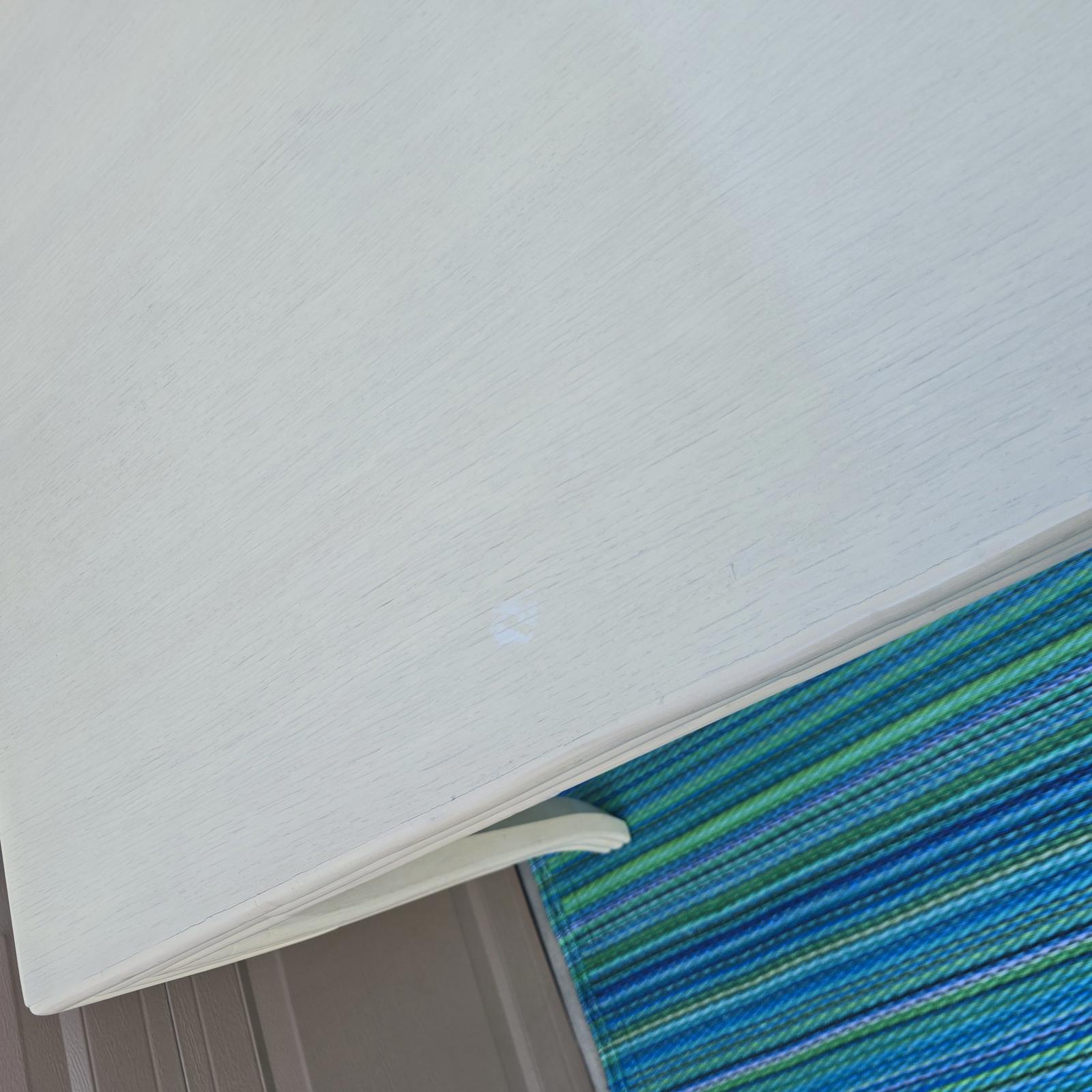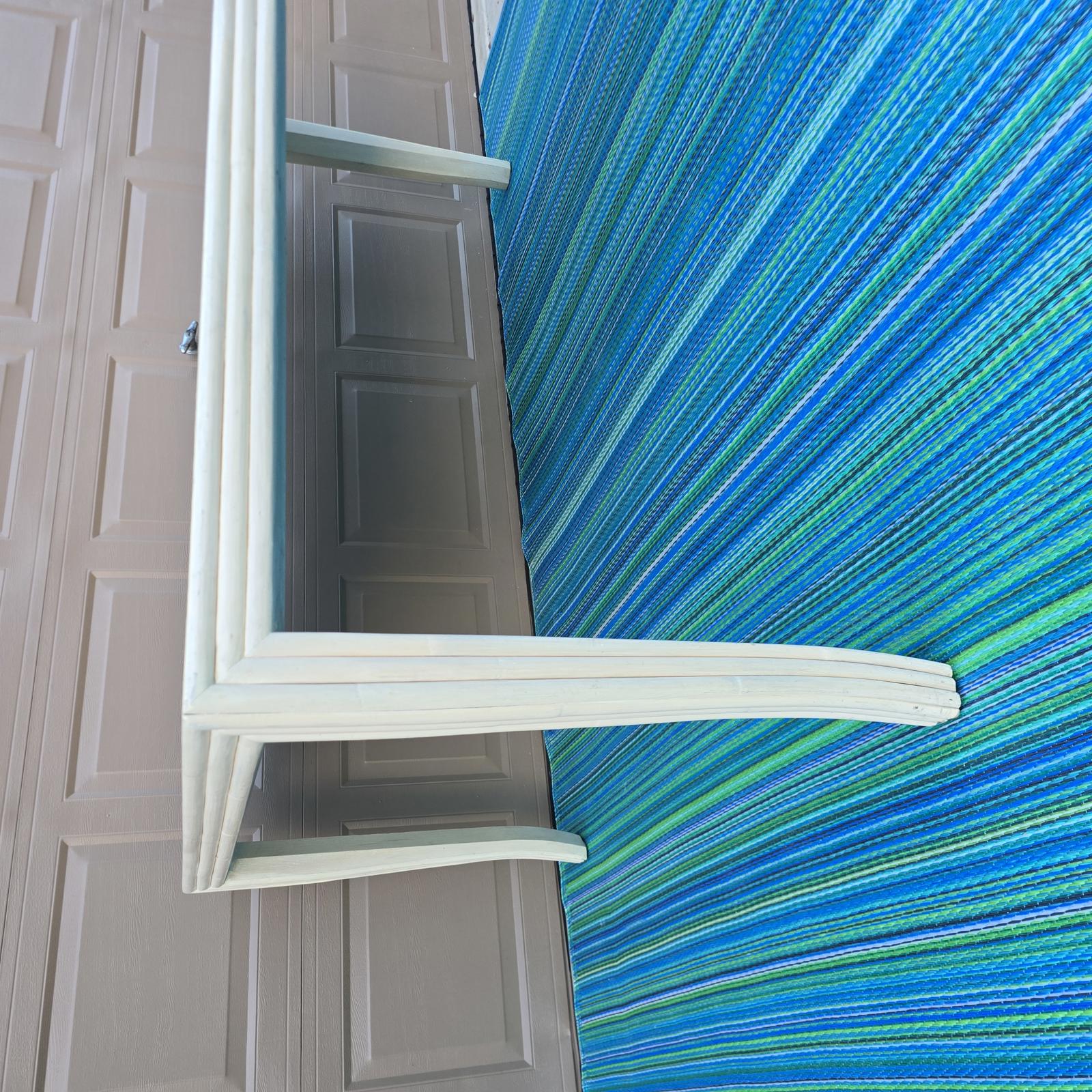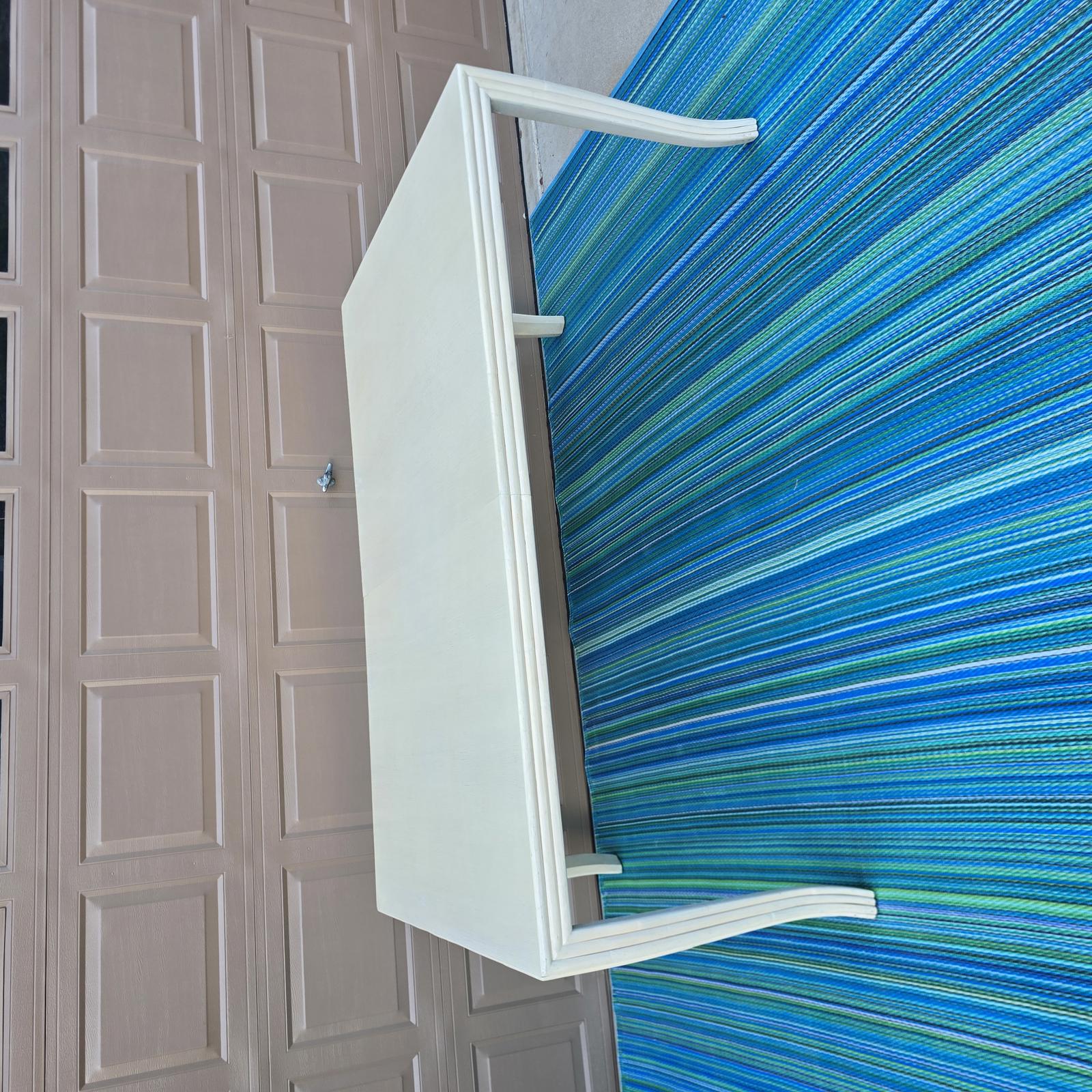 Rare find, McGuire oak dining table with a custom creamy-white finish. The table is framed by a faux-bamboo reeded apron and modern cabriole legs which give it that extra flair and timeless style. Perfect in a Coastal, Hollywood Regency, or Transitional setting. The McGuire San Francisco nameplate is attached underneath the table. Good condition with minimal wear consistent with age and use. Small white spot on table top. The table has a bracket underneath to hold 2 sides together. It does not open or extend. Please refer to photos as they are part of the description. 73"L x 46"W x 30.25"H.