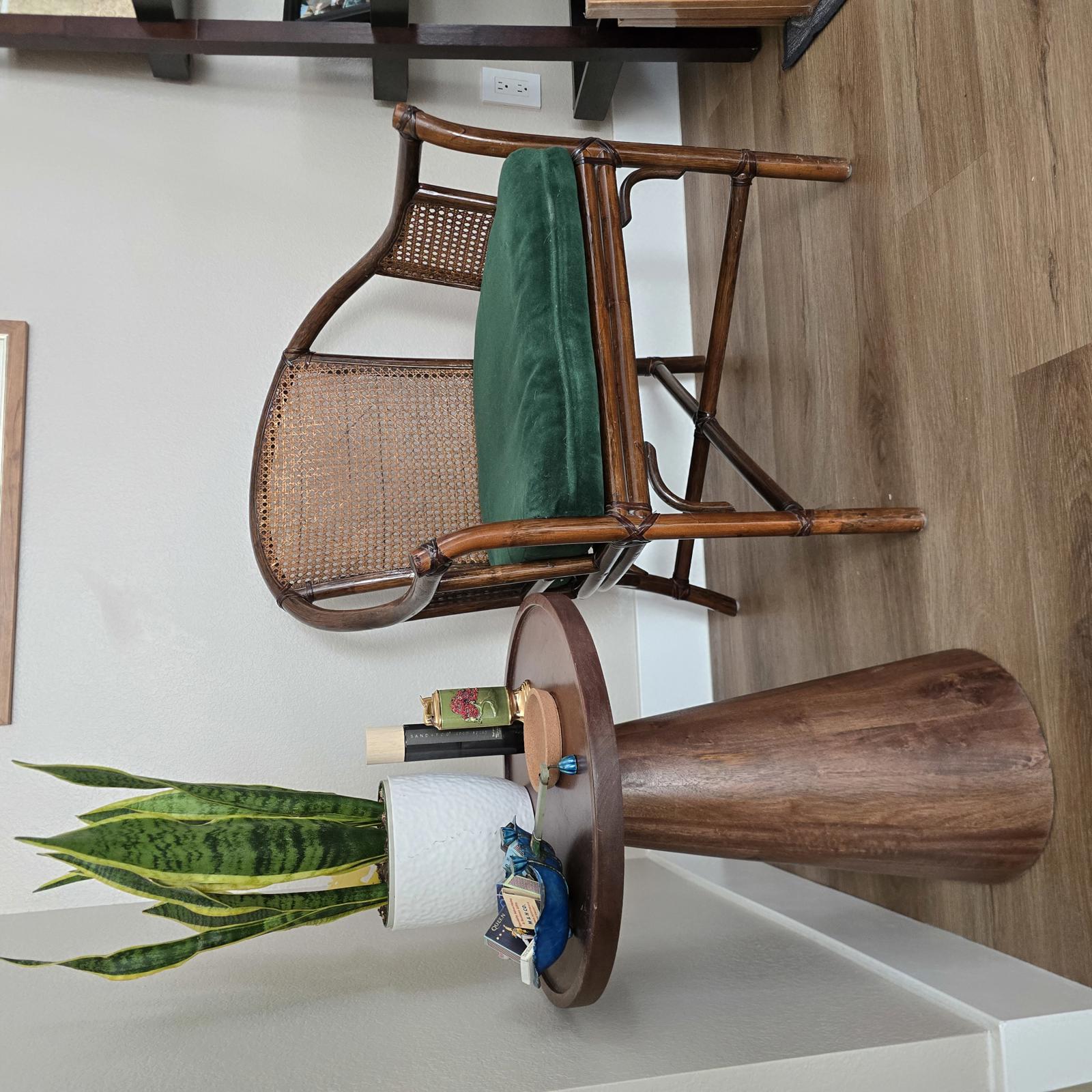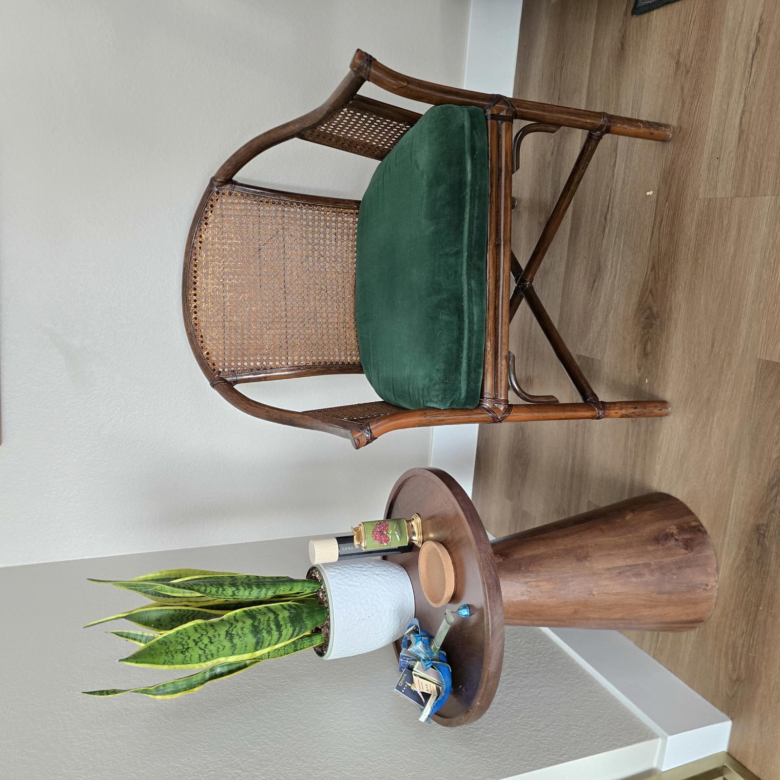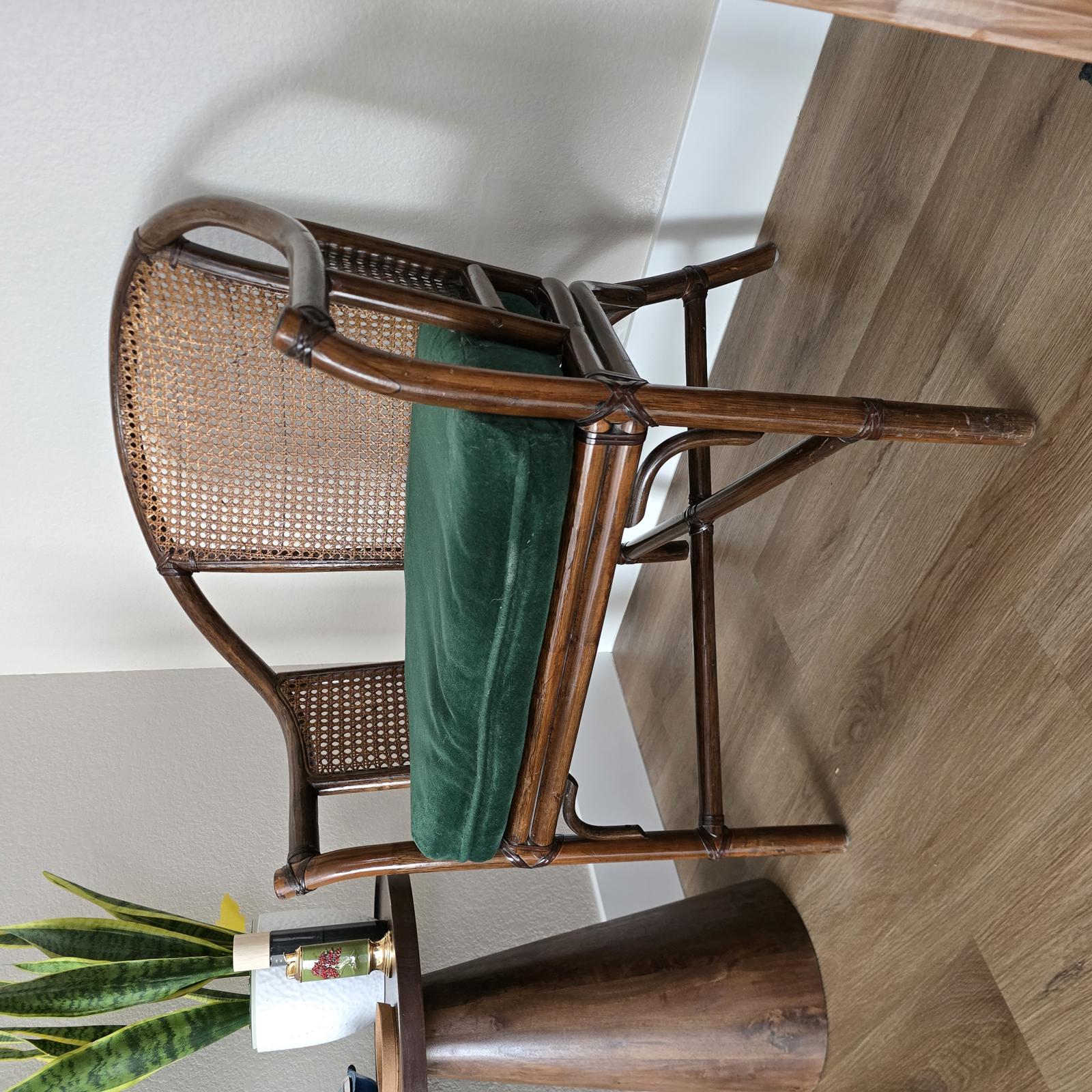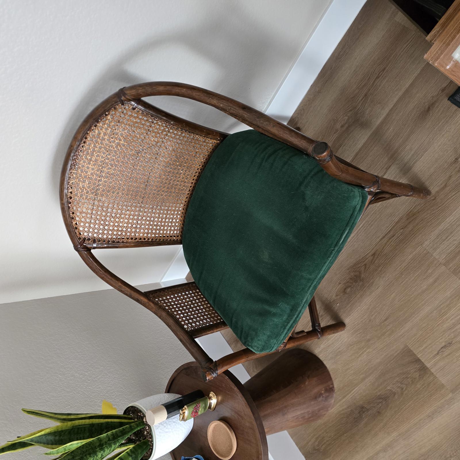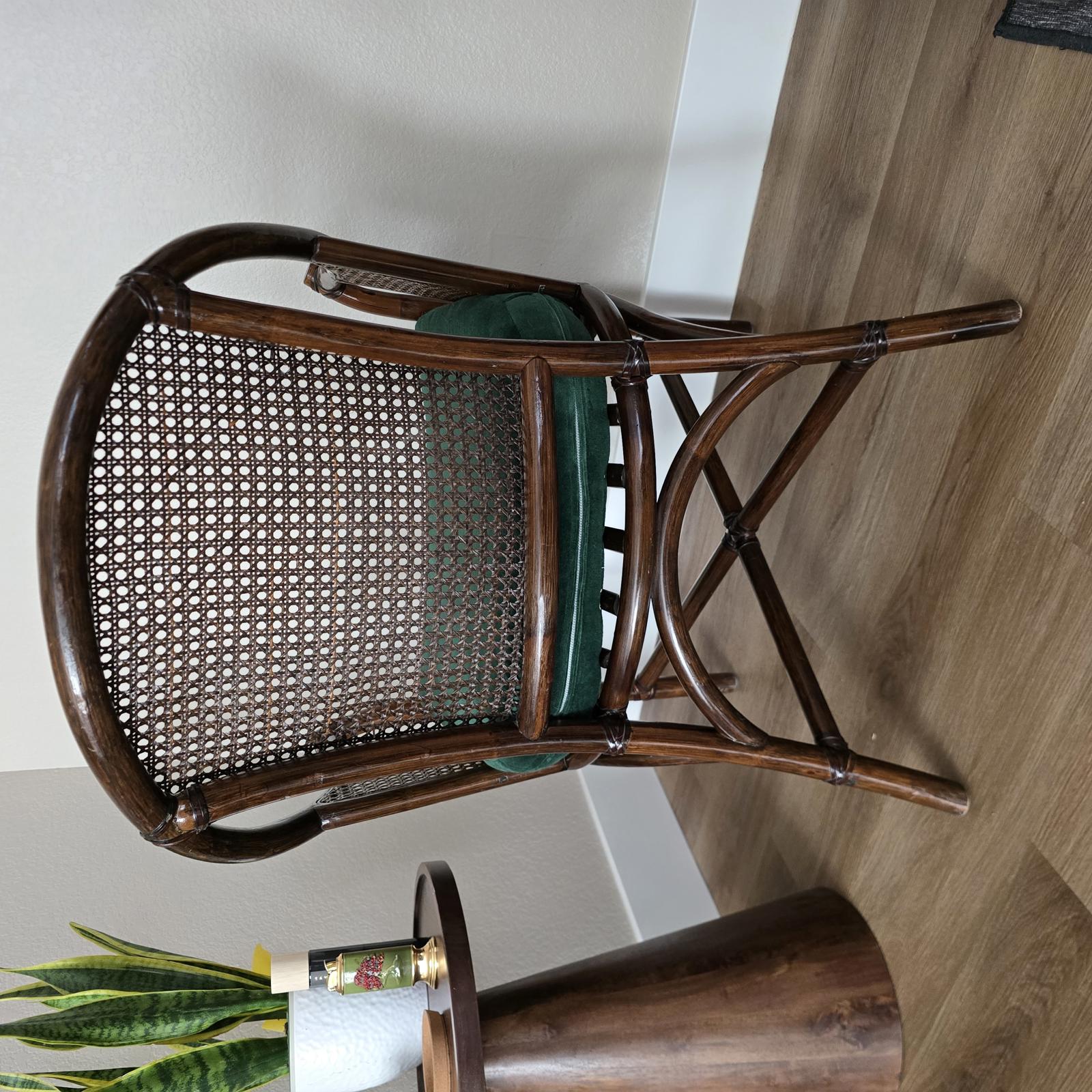 McGuire style wood barrel chair with woven rattan cane and leather strapping. The chair has a loose emerald green seat cushion which can easily be changed to suit your aesthetic. This is an elegant, curated accent piece which will look great in your home. Well made with minimal wear consistent with age and use. Please refer to photos for condition. Measures 32.5"T x 25"W x 23.5"D. Seat height 19".