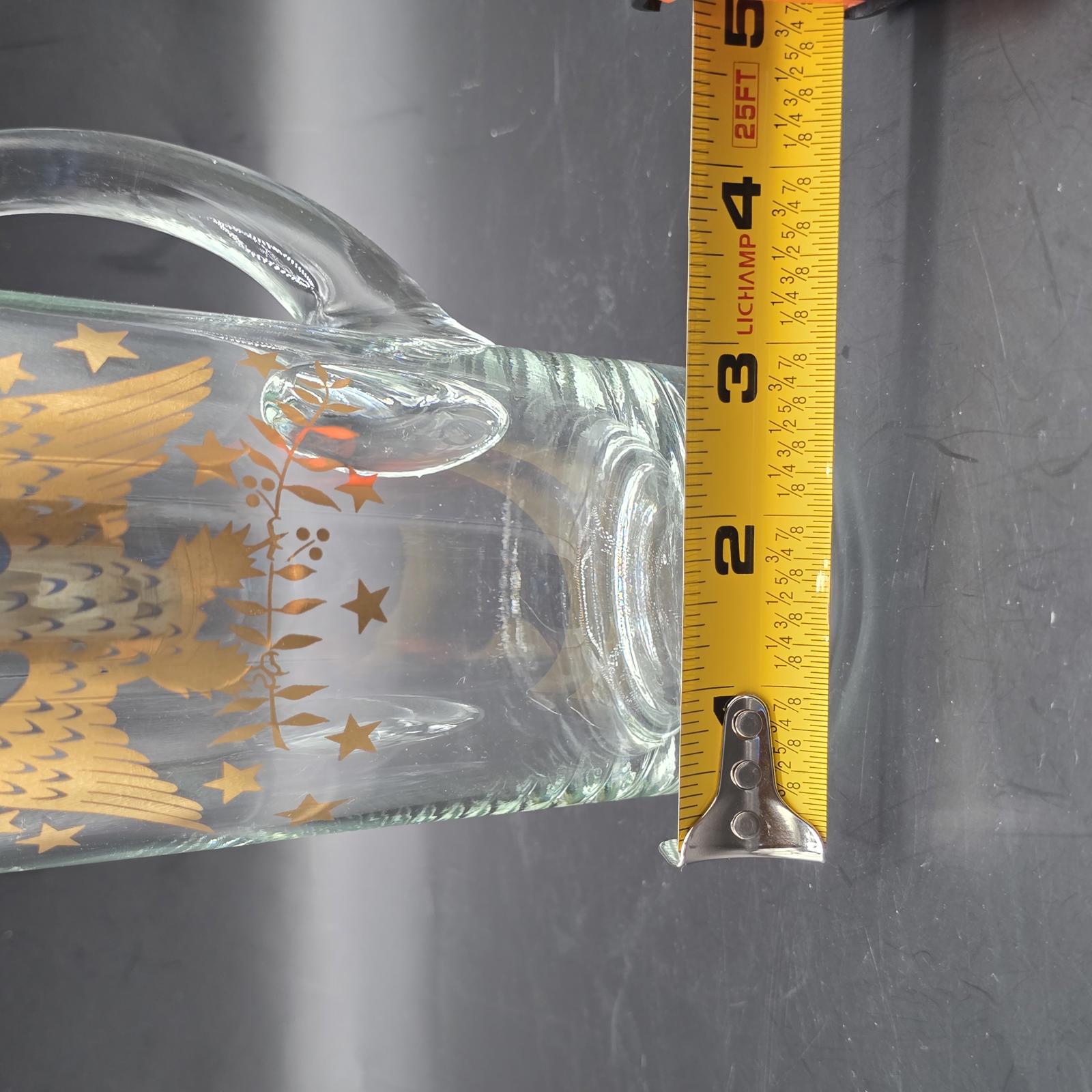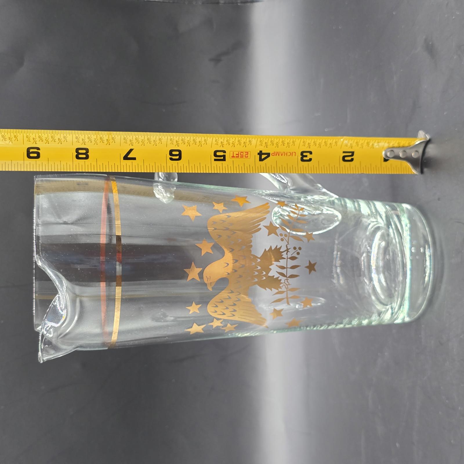 Glass pitcher depicting a patriotic eagle holding an olive branch and surrounded by stars in 22k gold leaf. Includes glass stirrer to mix your favorite beverages. c. 1960's. Good condition with minimal wear. Please refer to photos. Recommend hand wash. Measures 8.75" tall and 3" wide.
