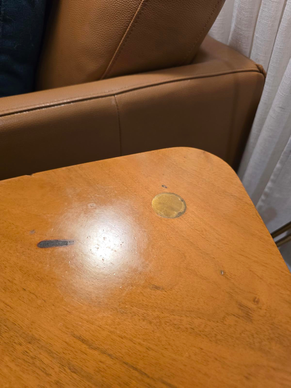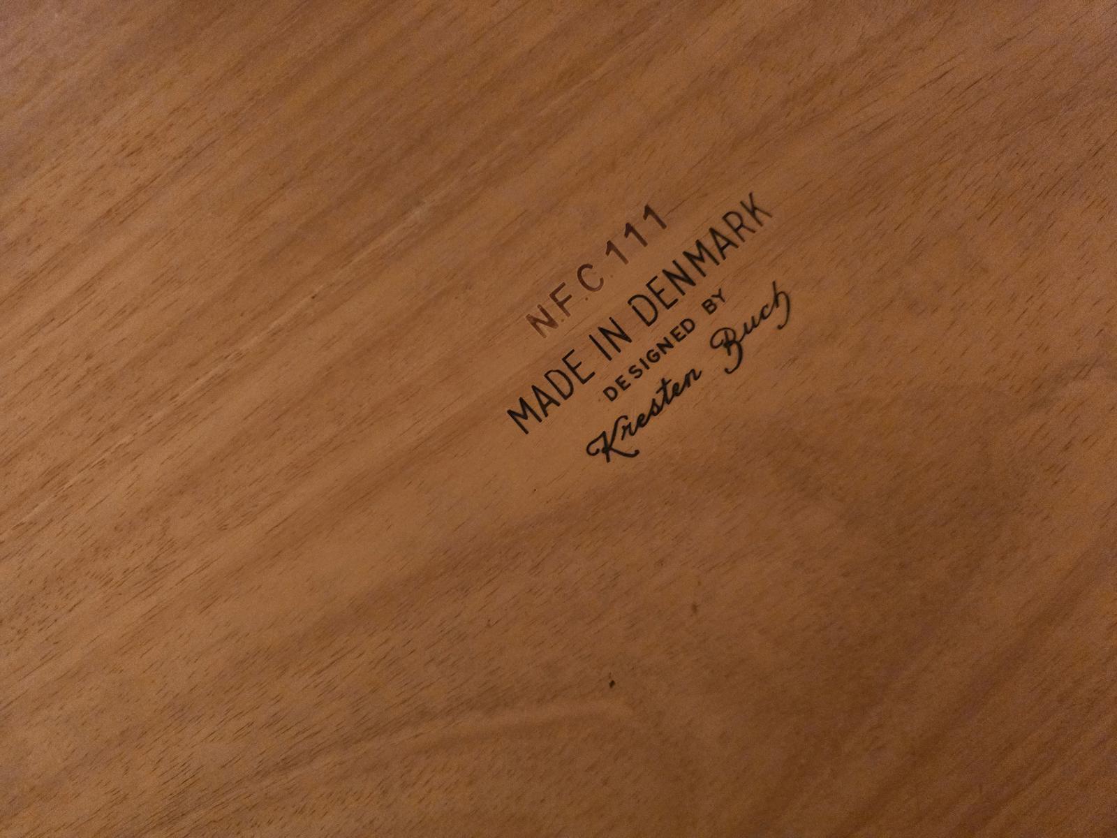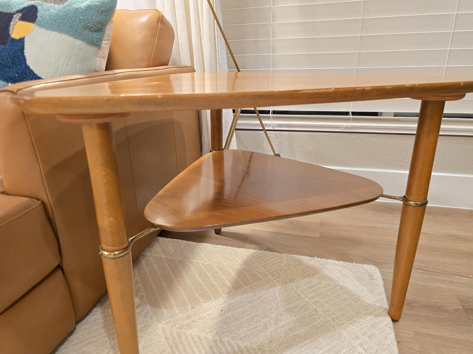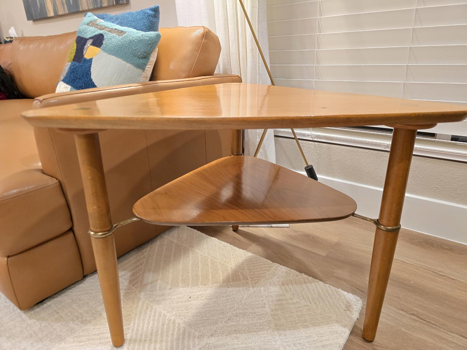 2 Tier, guitar-pick shaped table, with lower shelf artfully attached with brass hardware. Solid teak and brass accents on the table top. Made in Denmark, circa 1960's. Some wear visible consistent with age and use. Circa 1960's. 30.5"W x 22"T