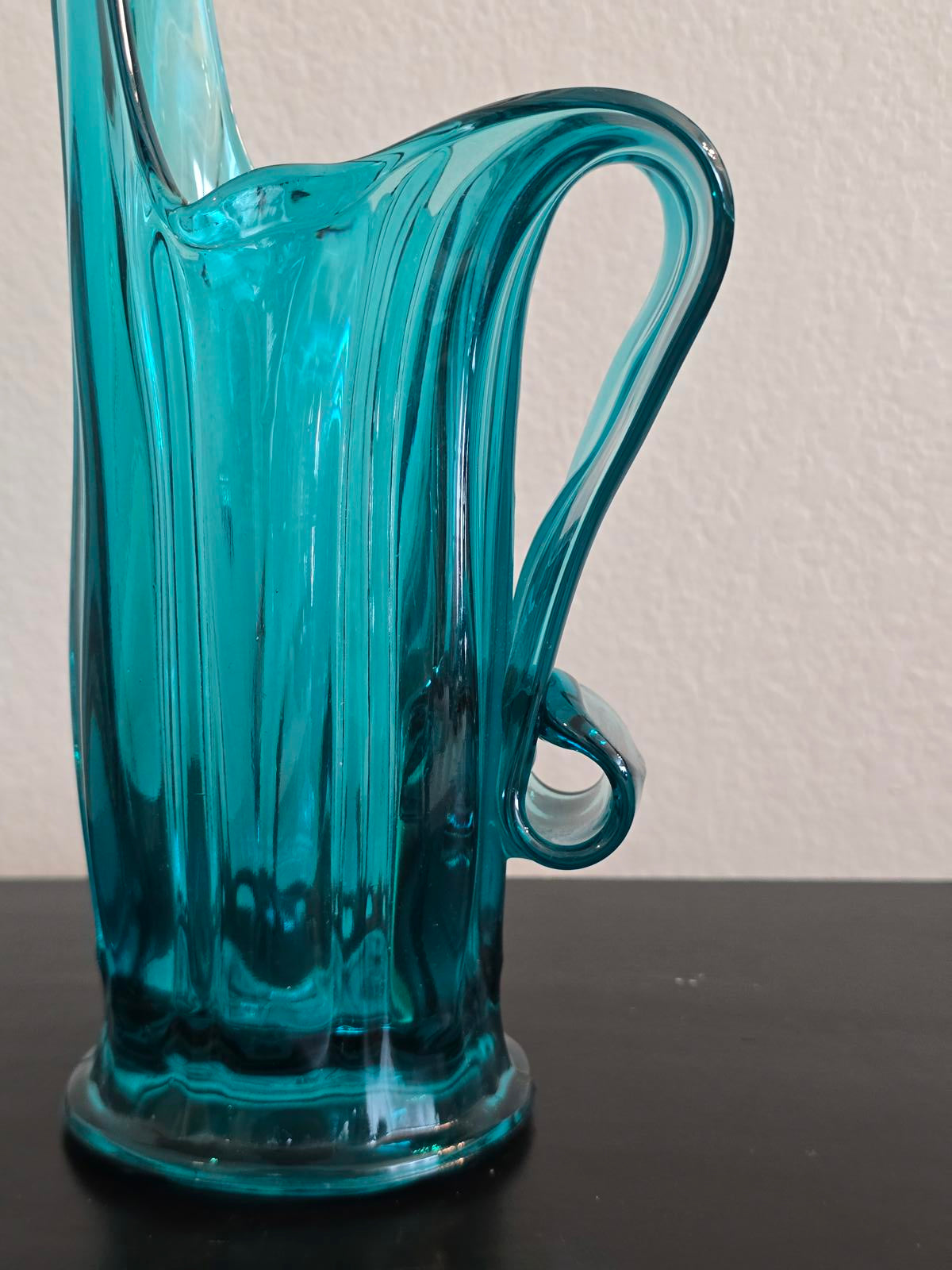 Handcrafted with pontil mark on bottom. Excellent condition L.E. Smith pitcher or vase with sculptural spout and complete flourished handle. Circa 1960's. 15" H x 4" W x 5" D