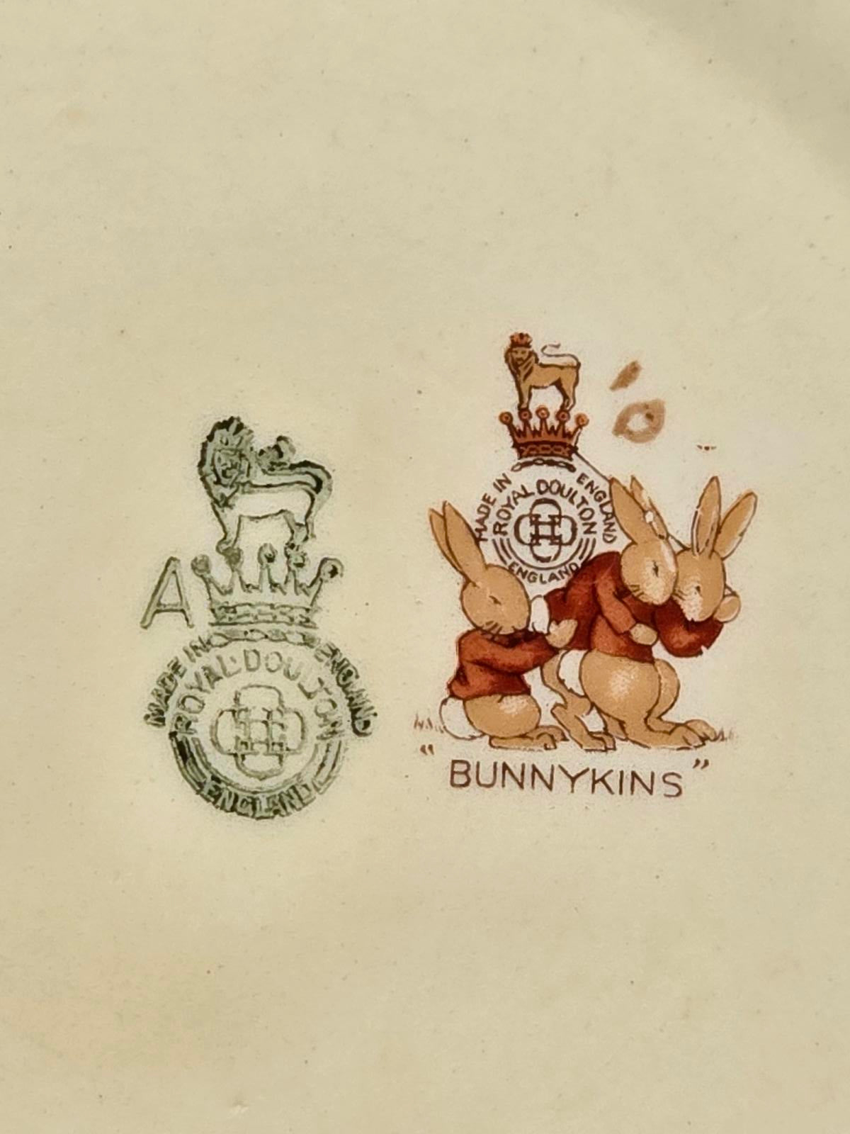 Rare, Royal Doulton, children's bowl can be used for display or as a catch-all for baby supplies. The Bunnykins were first introduced in 1934, and this is one of the earliest editions as evidenced by Barbara Vernon's signature. The bowl depicts a lovely scene of a young gentleman bunny doffing his tophat when greeting a shy young lady bunny. He is wearing a plaid frock coat, red polka-dot ascot, and blue trousers while she is wearing a patterned gown and a flowing red coat adorned with white trim and a hand muff. They are surrounded by bunnies bouncing through the grass. Bunnykins were especially popular because they were used by Princess Elizabeth and Princess Margaret. The bowl has the double backstamp c. 1937-1953. There is some crazing which can be expected for a piece of this age and use. Due to lead glaze, not recommended for food use. Measures 6in wide by 1.5in tall.