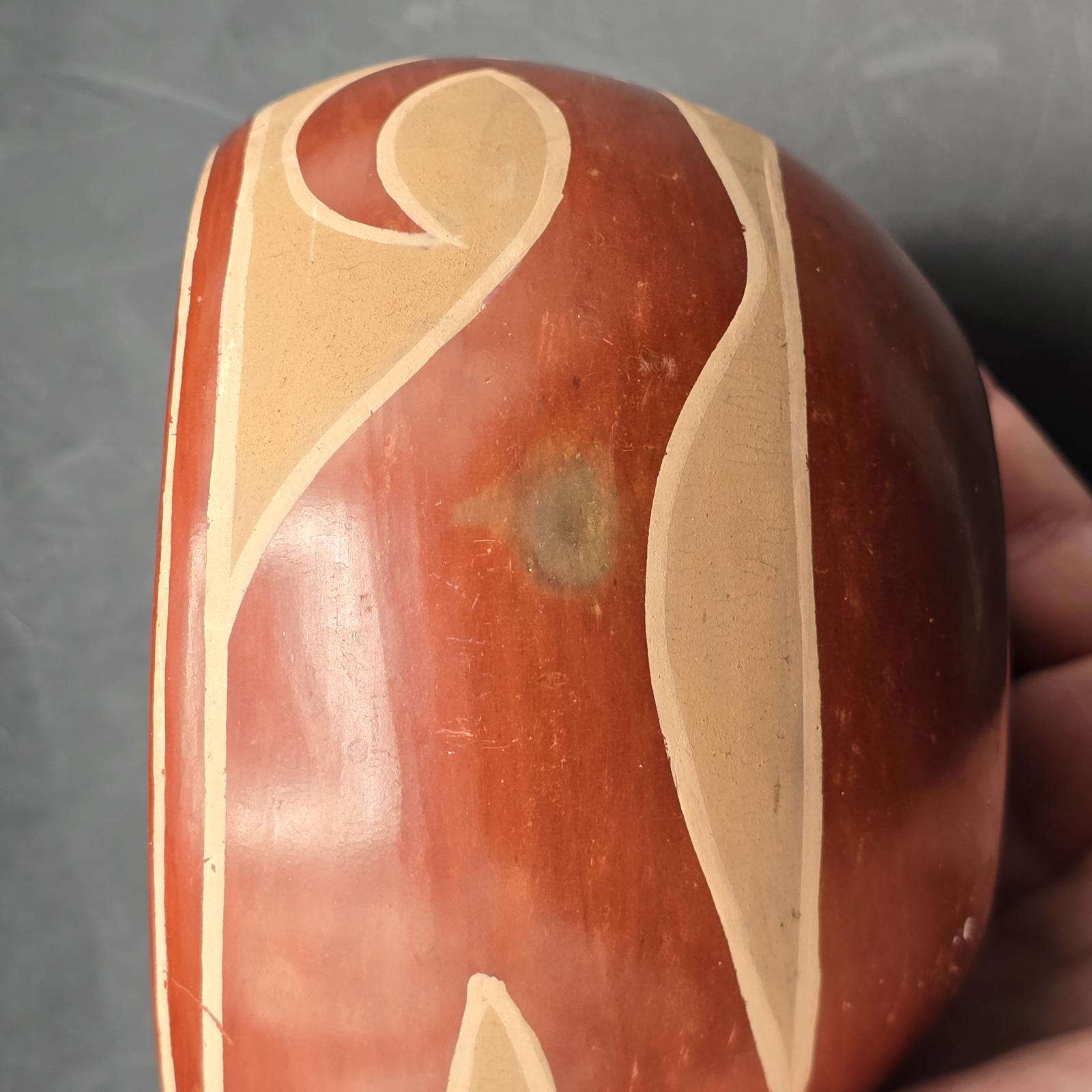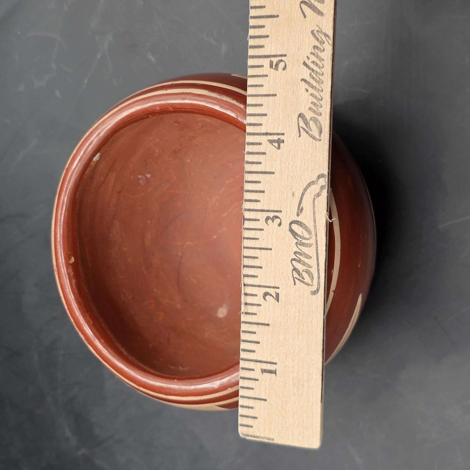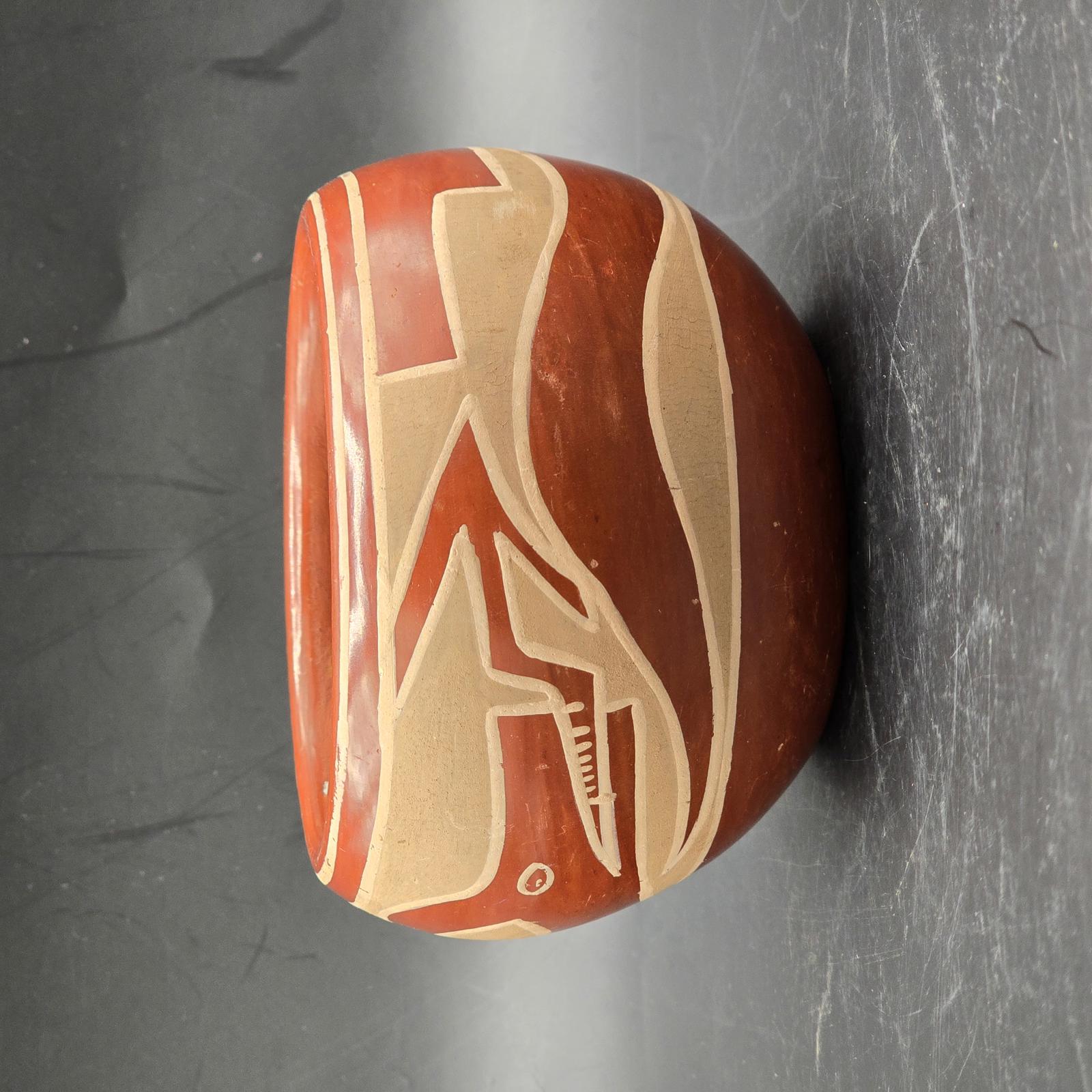 Native American, Santa Clara pottery bowl depicts the traditional decorative motif of Avanyu(the water serpent). The pottery goes through a special firing process to create the unique matte-red finish. A lovely piece to add to your collection. Unsigned. Wear consistent with age and use. Please refer to photos as they are part of the description. Approximately 3.25"T x 5"D.